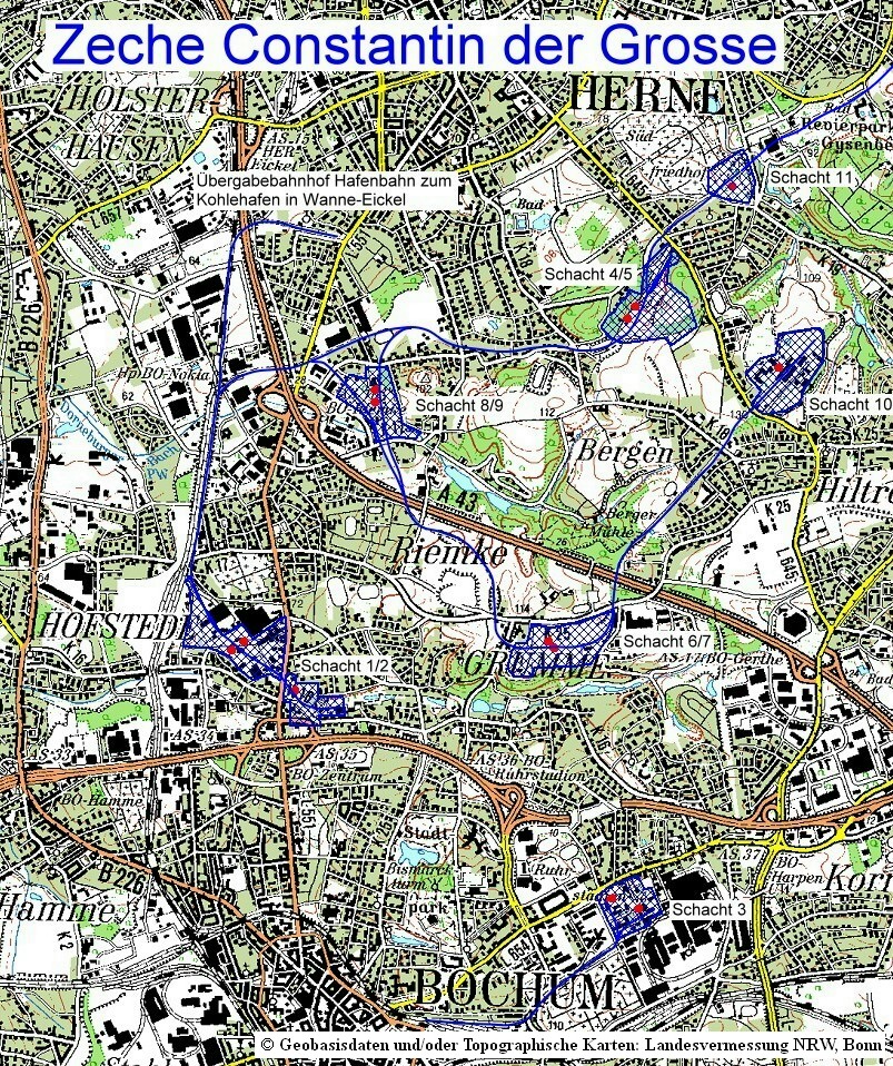 voneinander entfernt sind, aber keine direkte Gleisverbindung haben. Die Zeche Constantin als Ganzes war schon früh eine Großzeche,