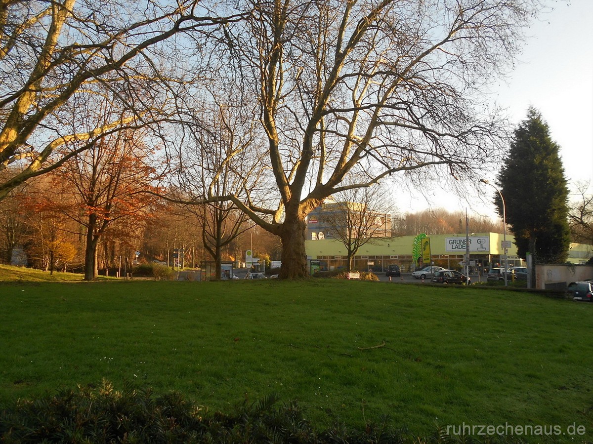 kleine Seilscheibe mit einer Informationstafel auf den Zechenstandort hin. Der Name des Traditionslokals "Zur Ritterburg" neben dem