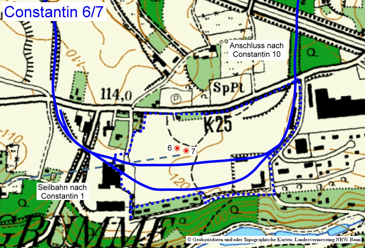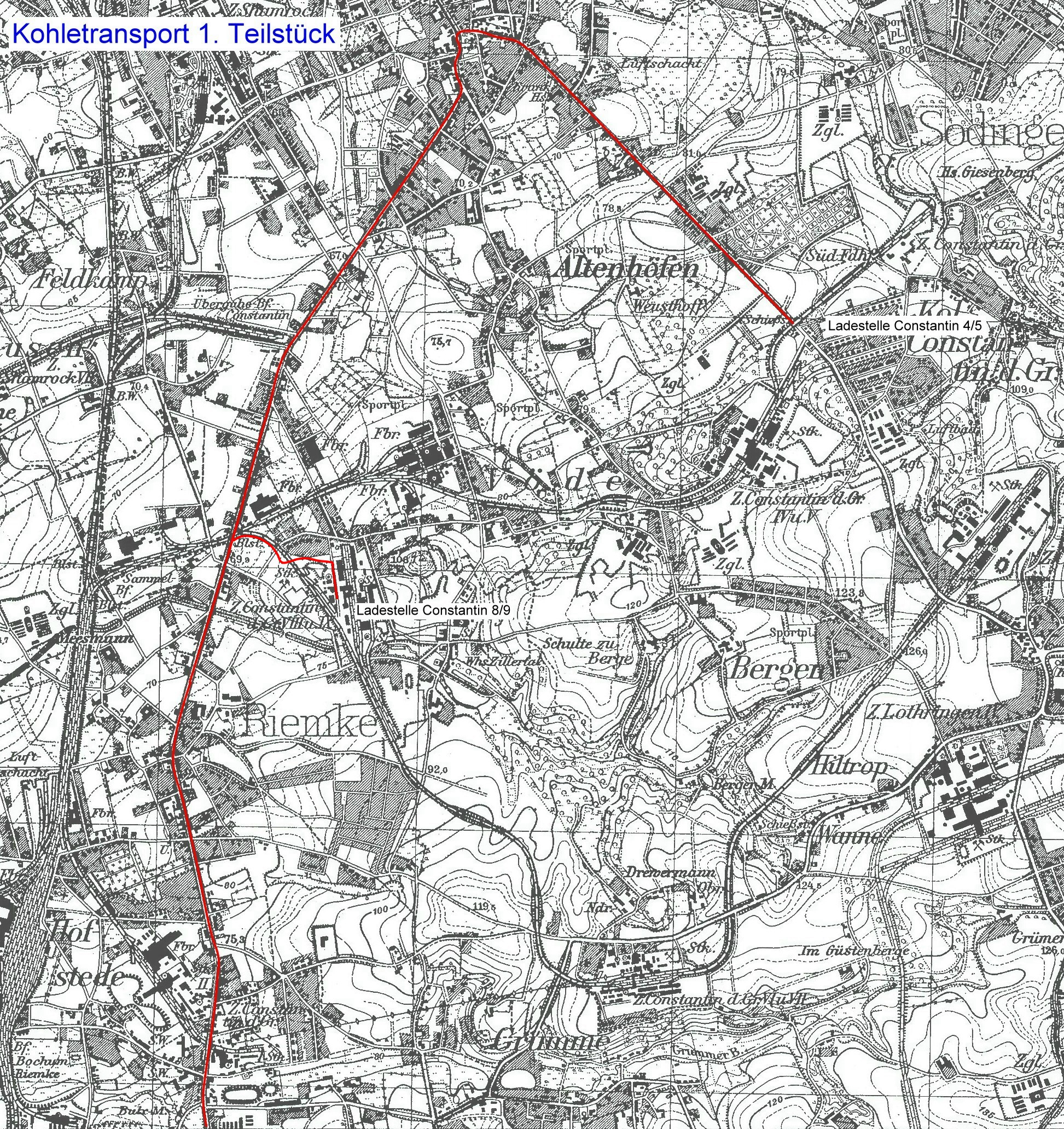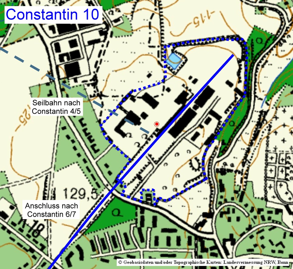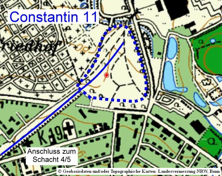 Constantin 1 bei 70 m, der Schacht Constantin 10 bei 130 m. Die Übersichtskarte zeigt sehr gut die Problematik der notwendigen Anbindung