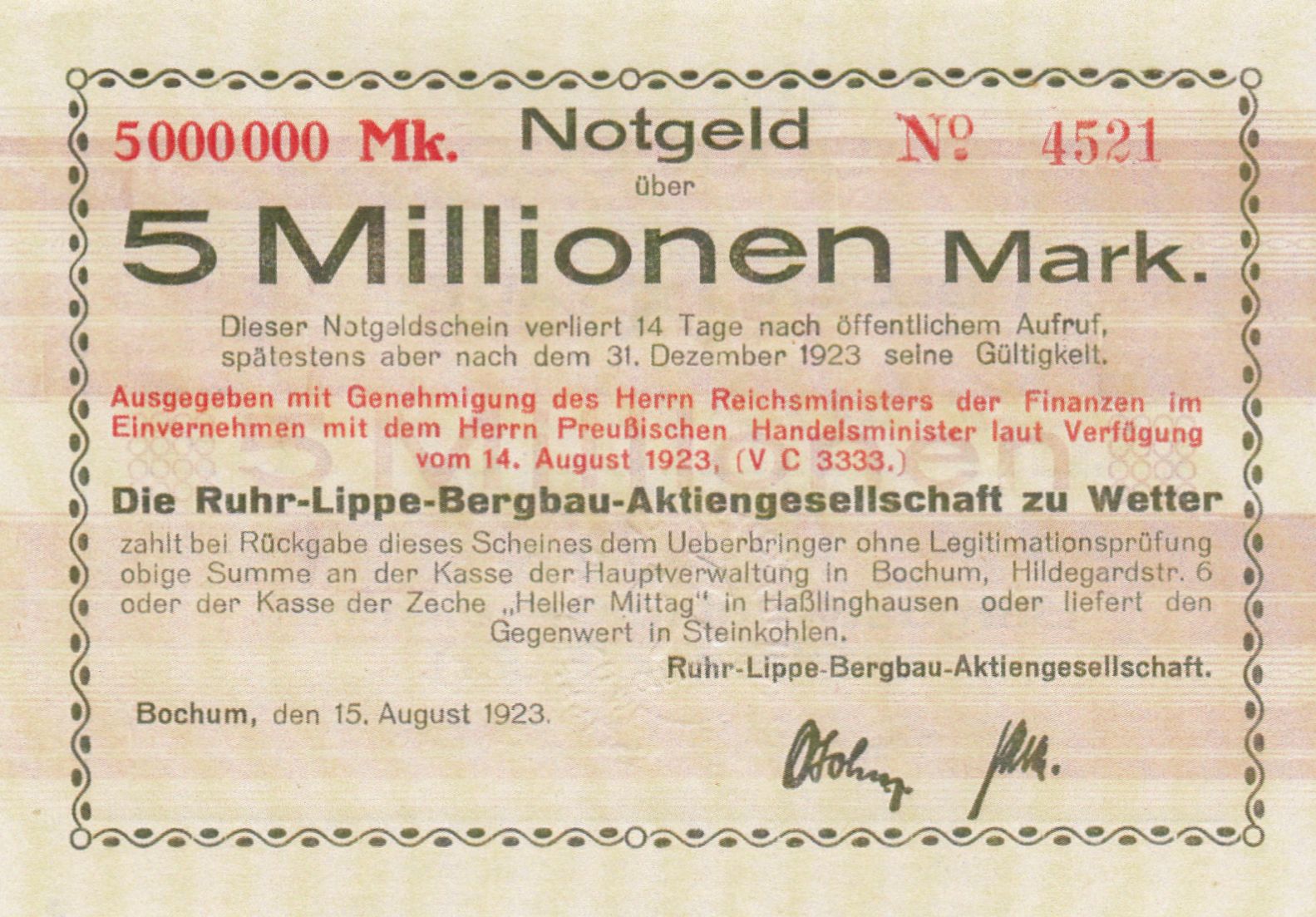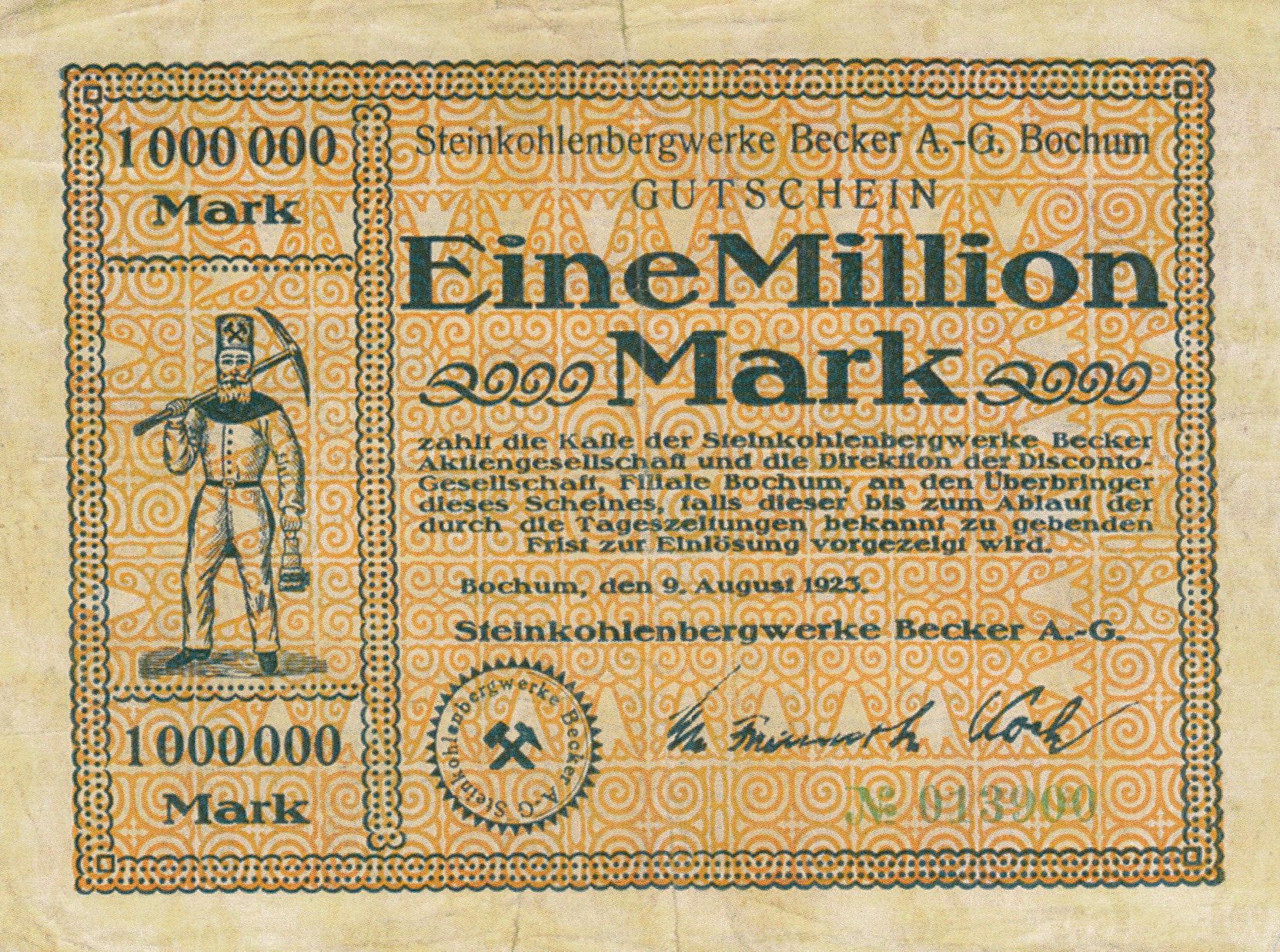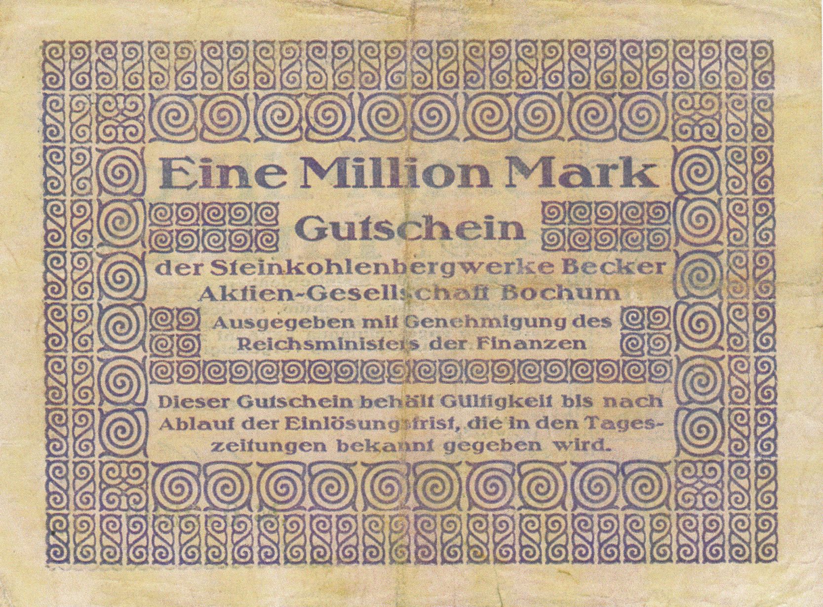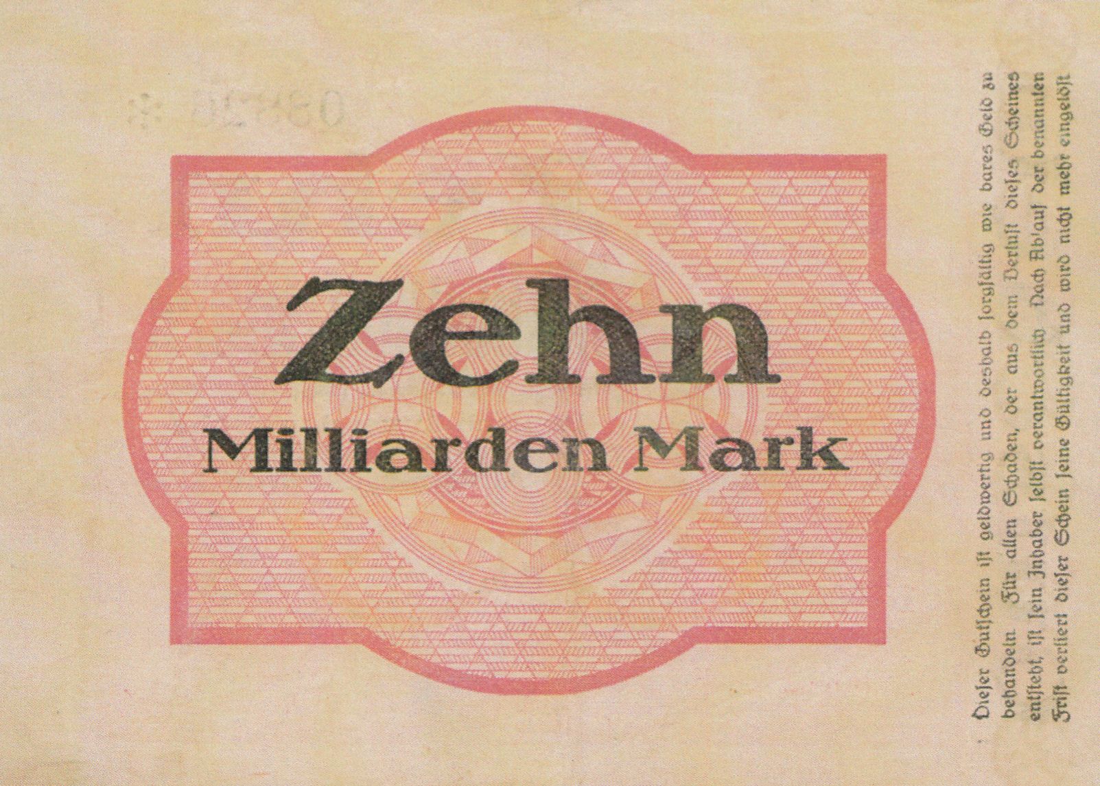 Mit der Hyperinflation wurde nur noch eine Seite der Scheine bedruckt, die weiter ein Wasserzeichen hatten. Für die Zeche Deutschland