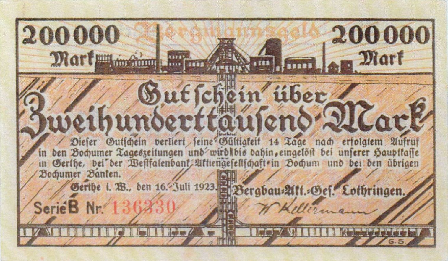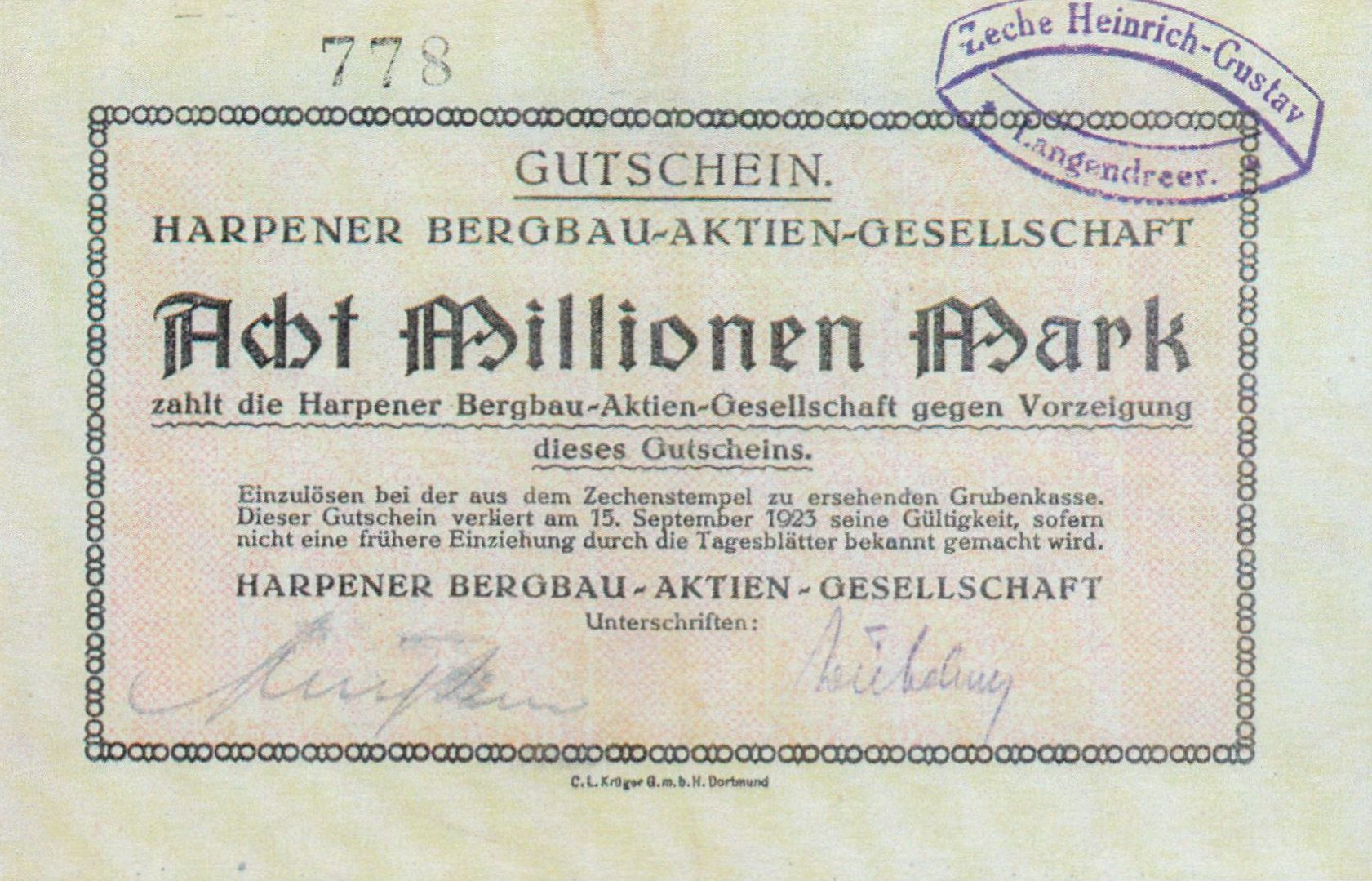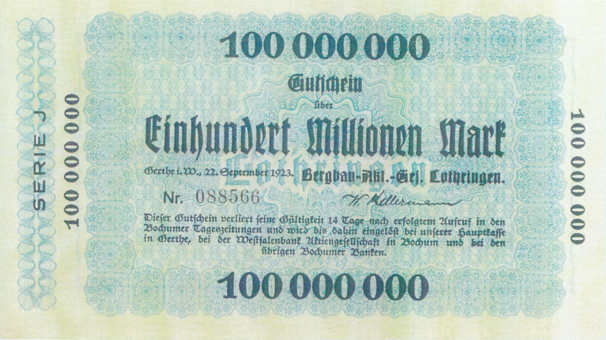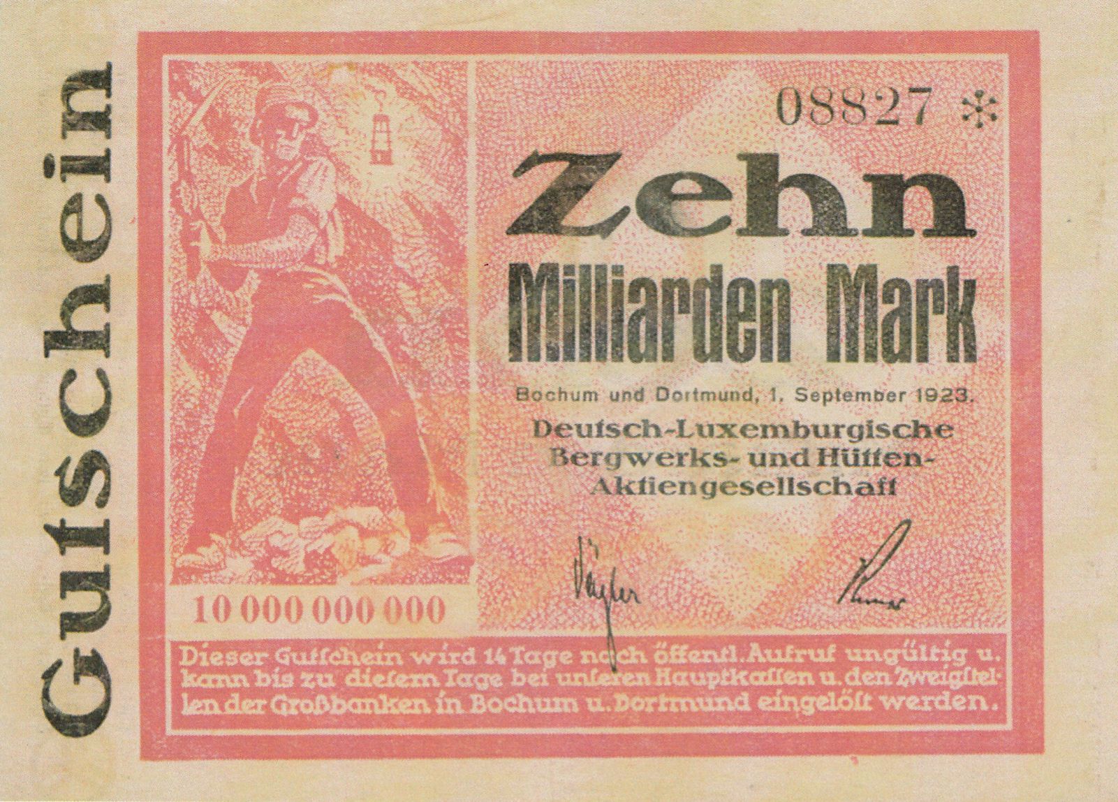 Mit der Hyperinflation wurde nur noch eine Seite der Scheine bedruckt, die weiter ein Wasserzeichen hatten. Für die Zeche Deutschland