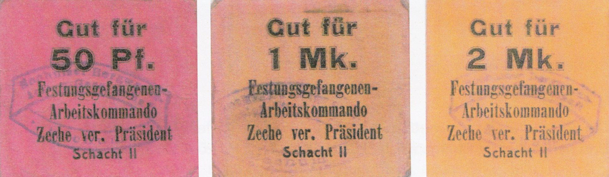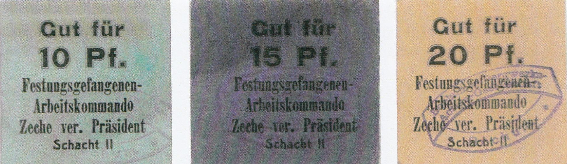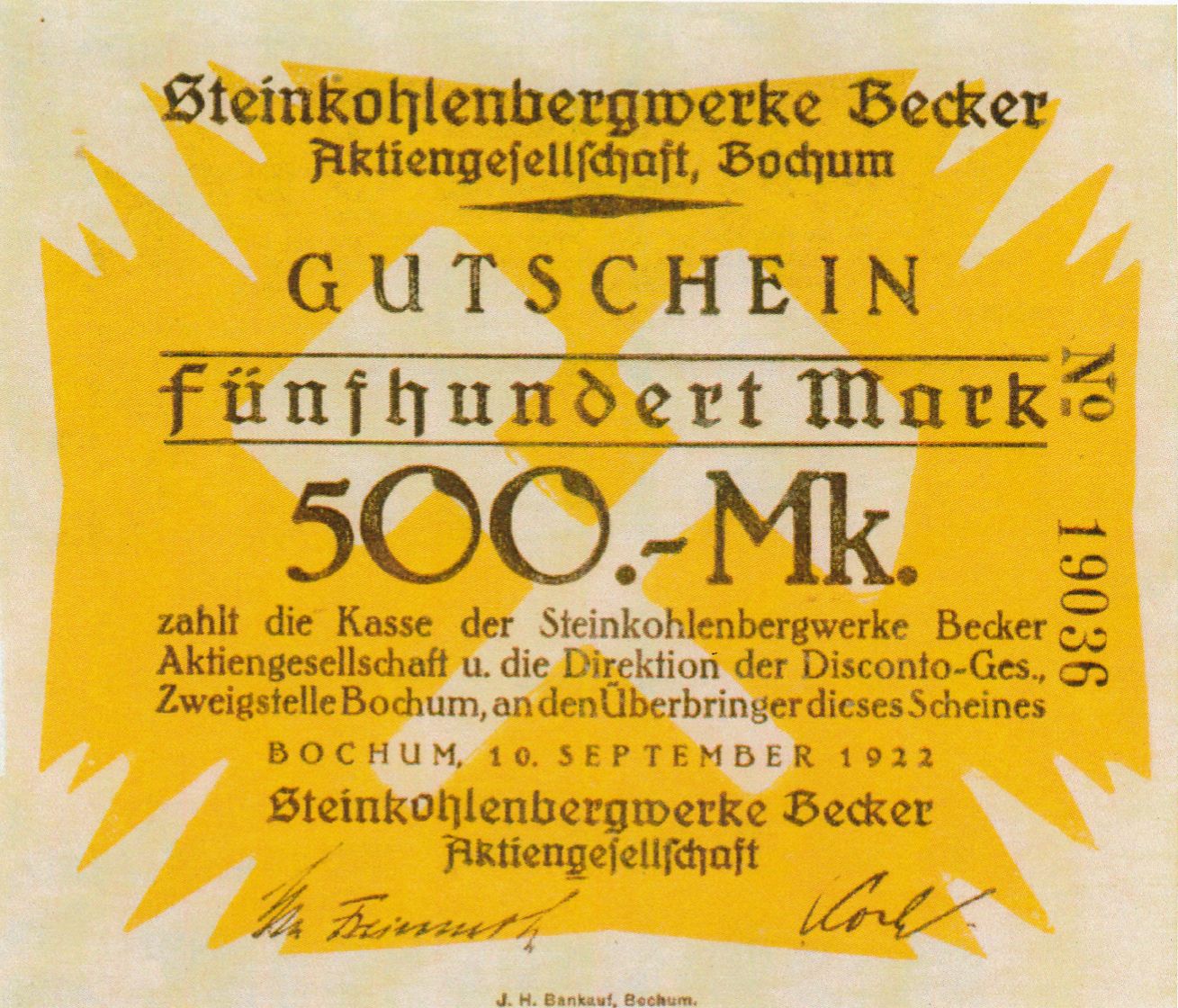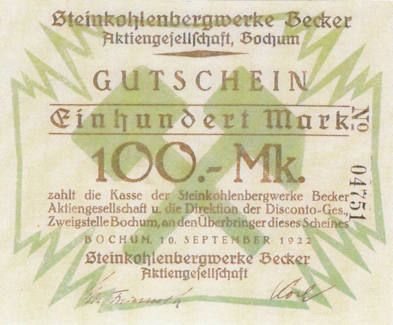 der Nominalwert aufgedruckt. Die Zechengesellschacht Becker mit der Zeche Präsident druckte auf die Rückseite eine Ansicht der Schachtanlage 2,