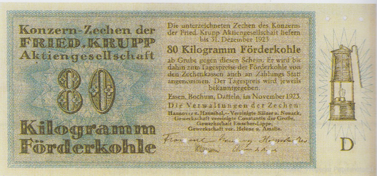 Das für die Kruppzechen aufgelegte Notgeld hatte ähnlich wie bei vielen Währungen statt Gold eine garantierte Menge Kohle als
