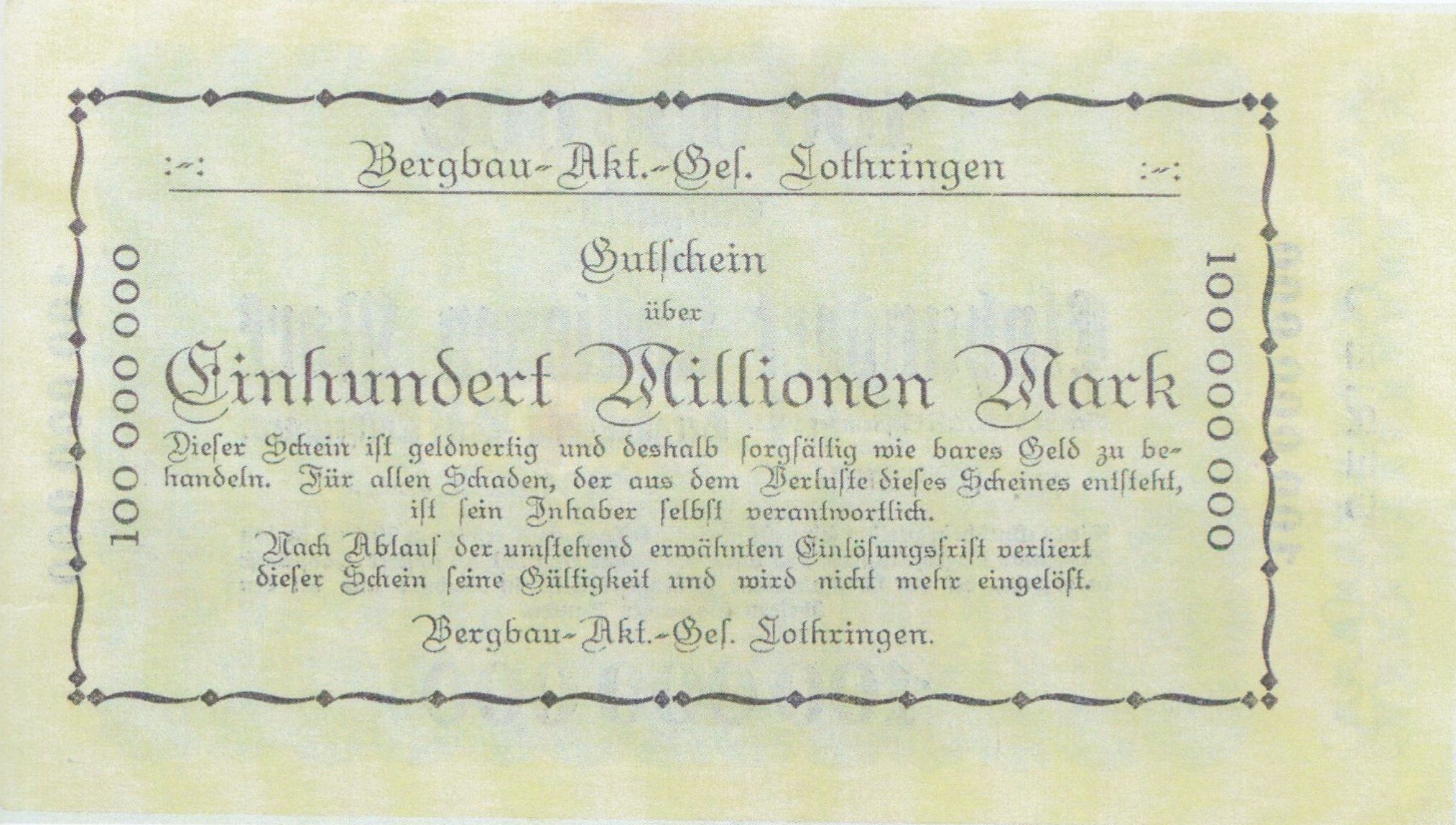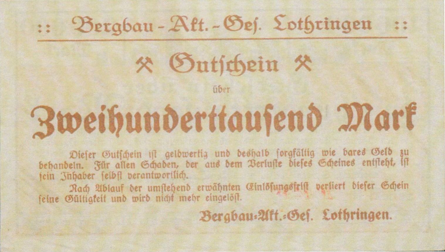 Sicherheit. Das Notgeld der Zeche Lothringen hatte anfangs auf der Vorderseite eine stilisierte Zeche mit Untertageansicht. Später wurde nur