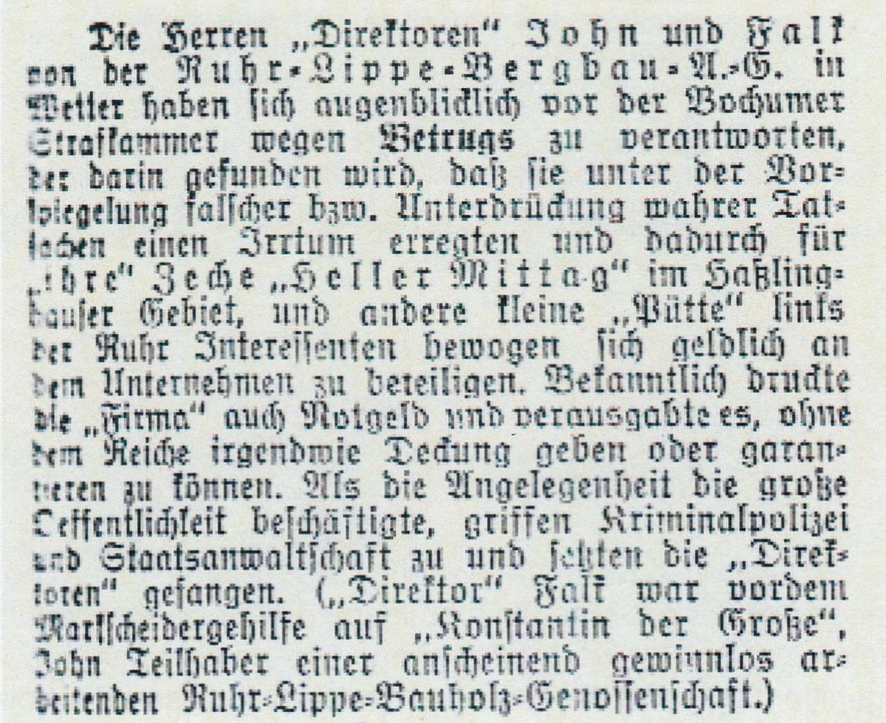 Es gab sogar einen Betrug mit Notgeld einer erfundenen Gesellschaft. Es gab einen erfolglosen Holzhandel gleichen Namens. Die Zeche Heller Mittag