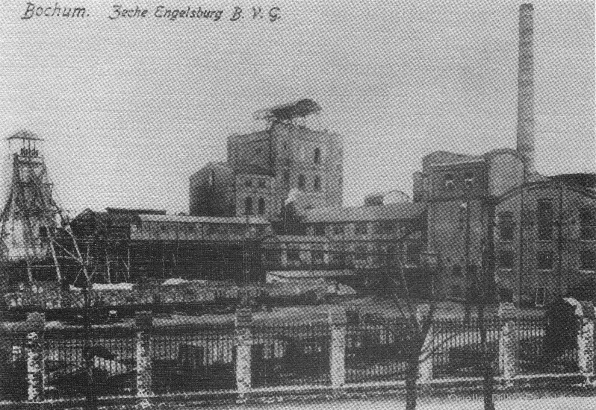 Im Jahr 1829 wurde die Gewerkschaft Engelsburg gegründet. Die in ihr konsolidierten Stollenzechen bauten schon seit 1739 in der Berechtsame Kohlen ab. Der Name ist wahrscheinlich von der Fluchtburg der Päpste in Rom abgeleitet. Die Vorgänger werden hier kurz beschrieben. Die nach der Kommunalreform 1926 eigentlich in Wattenscheid liegende Zeche wurde mit dem Walzwerk auf Wunsch des Bochumer Vereins abgetrennt und dem Bochumer Stadtteil Weitmar zugeschlagen.