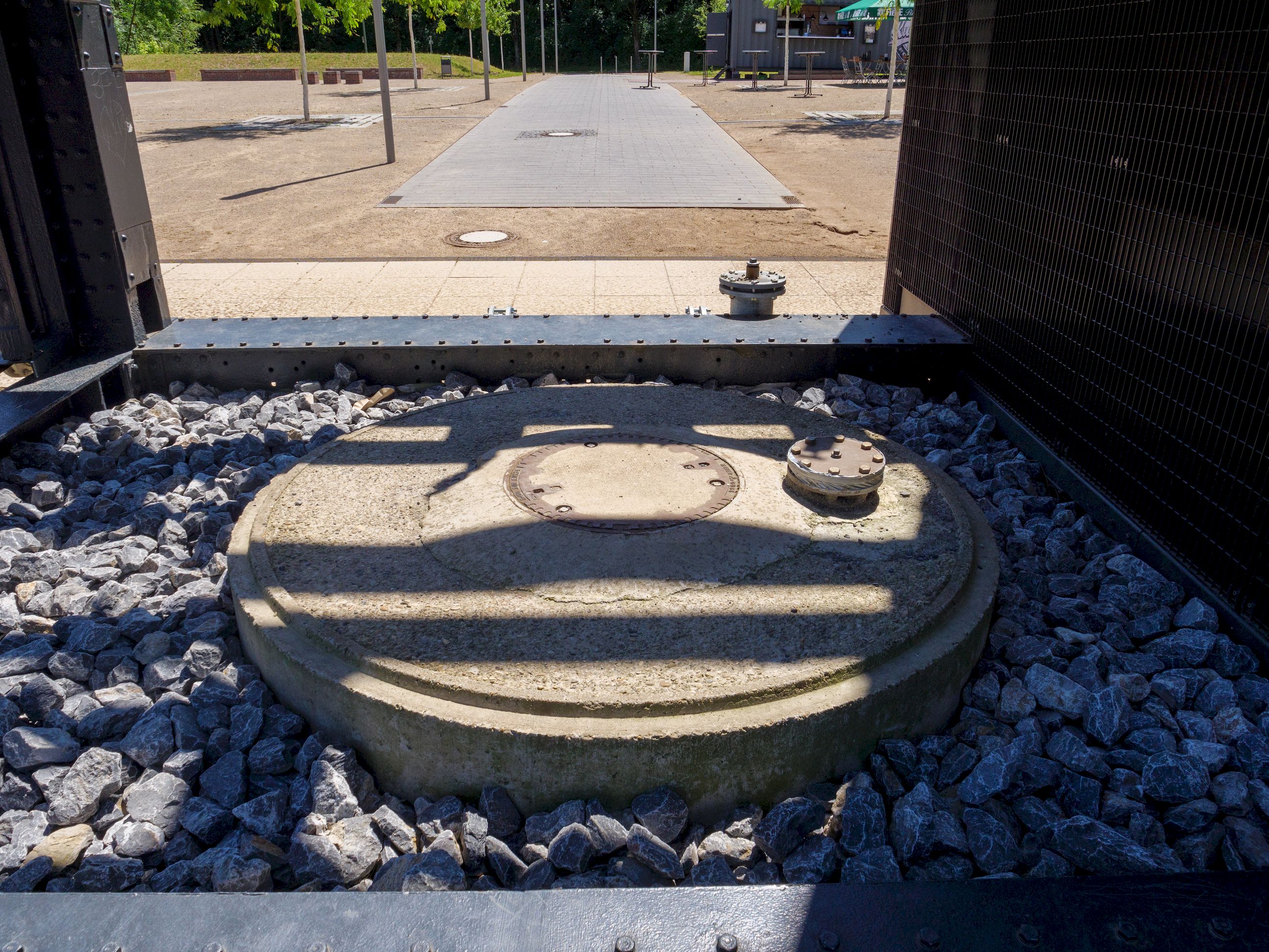 Der Schacht 3 liegt in der Freifläche neben Schacht 4, erkennenbar an Schachtdeckel und Infotafel. Schacht 6 ist mit einem Parkplatz