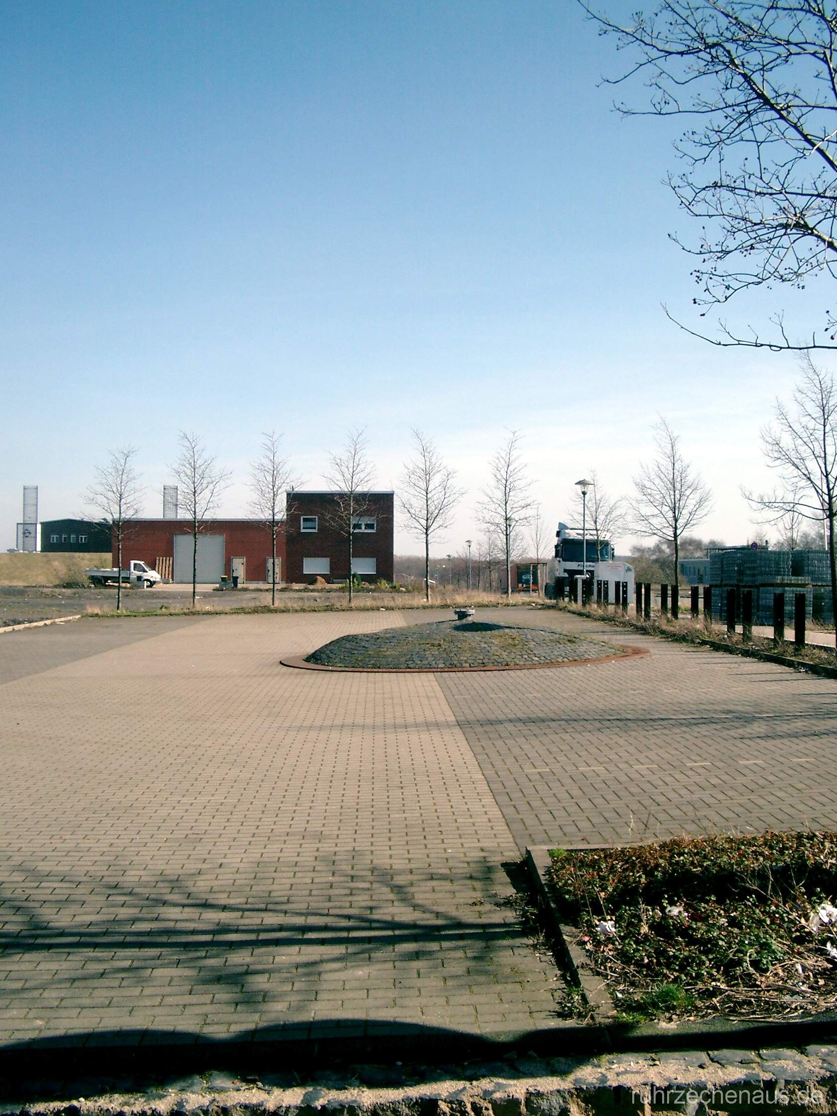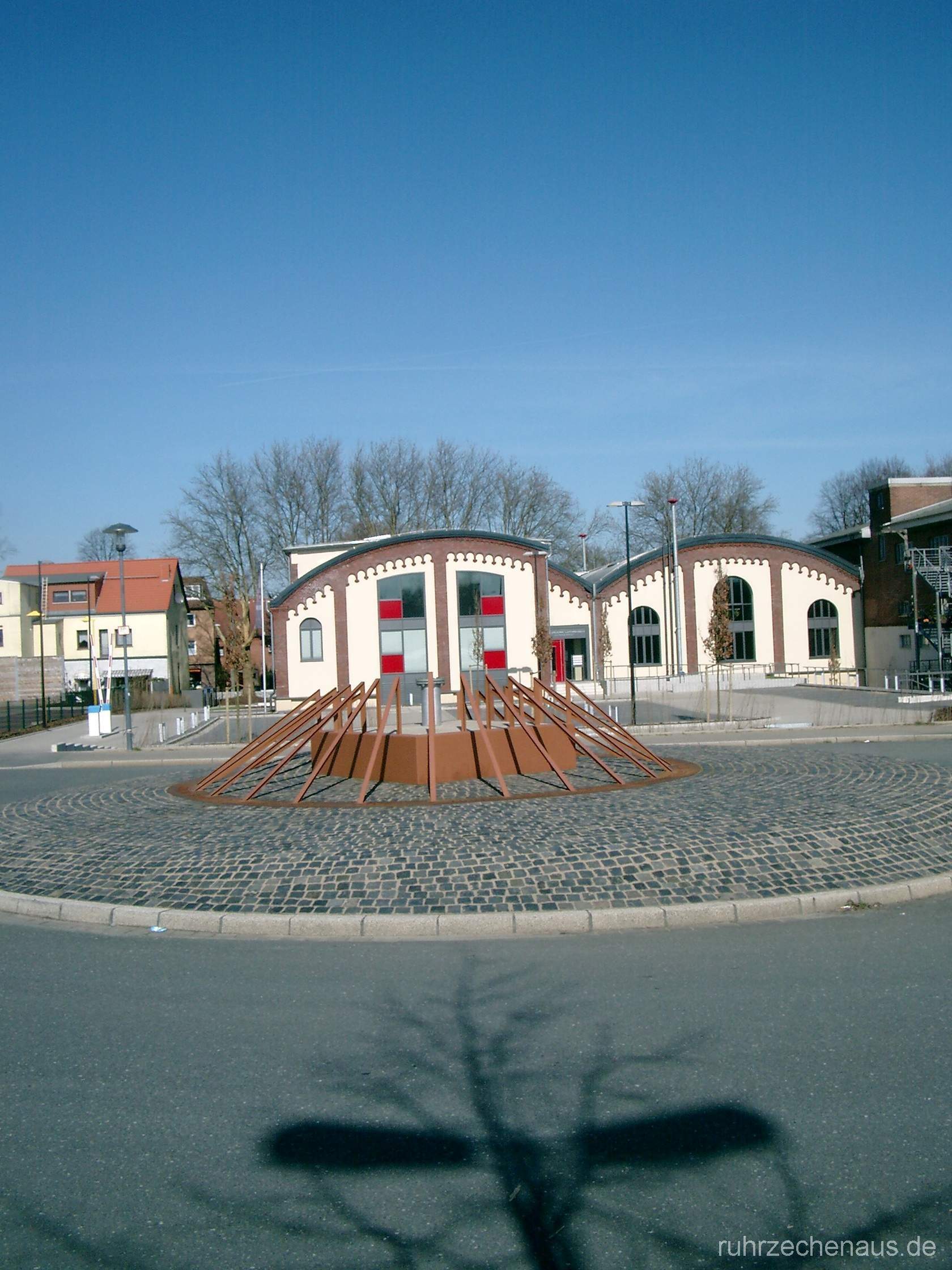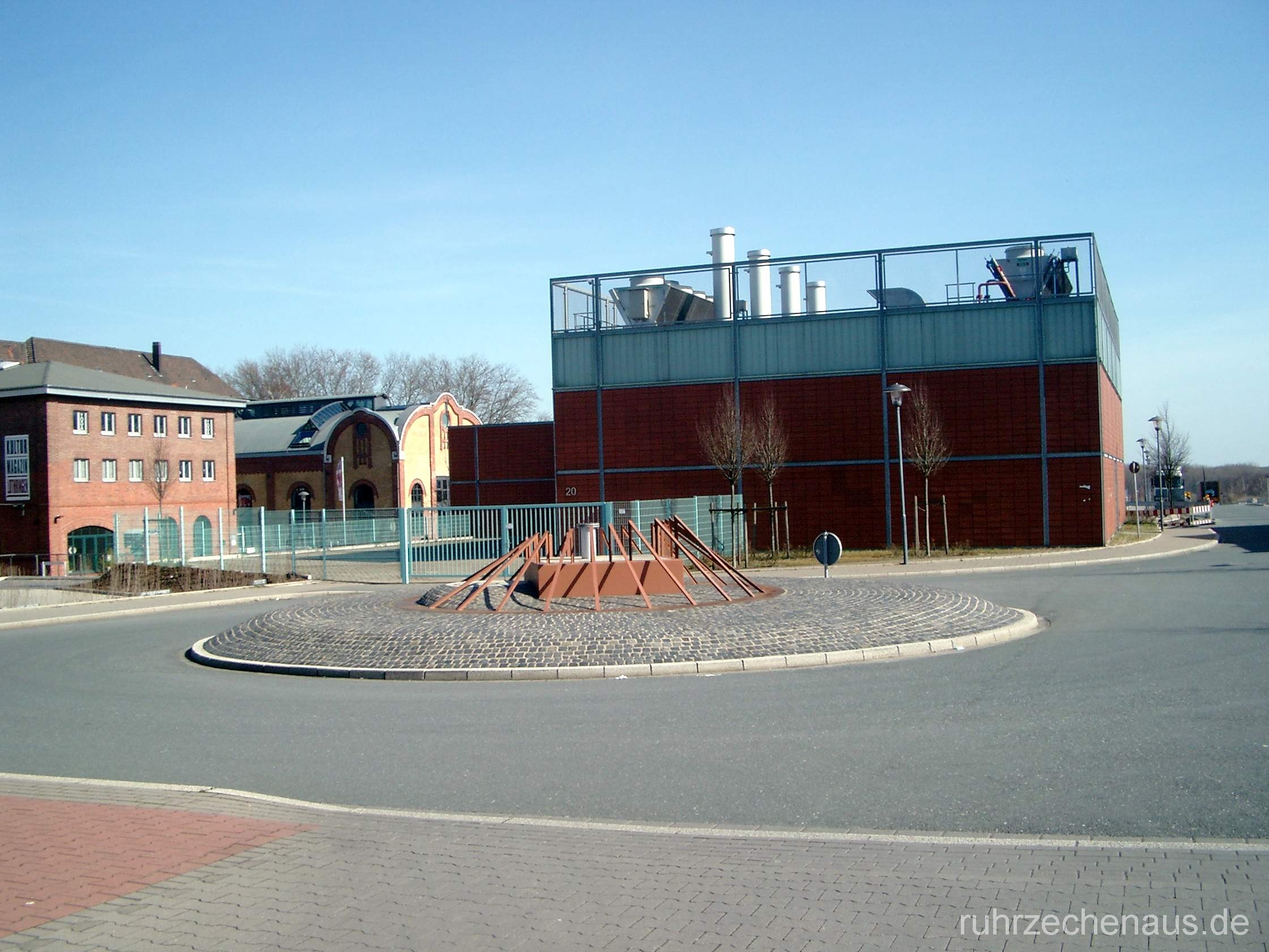 in einen Kreisverkehr integriert und mit einer kleinen Stahlskulptur markiert. Dazwischen befindet sich ein Blockheizkraftwerk