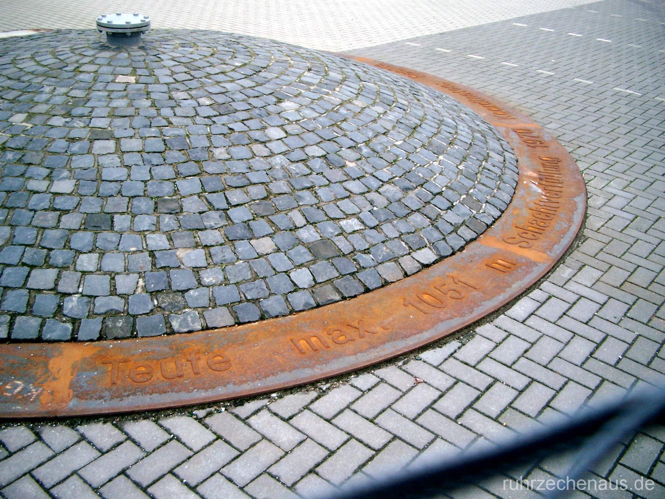 Schacht 1 erhielt eine kuppelartige Aufpflasterung mit einem umlaufenden Stahlband, das seine Koordinaten trägt, Schacht 2 wurde