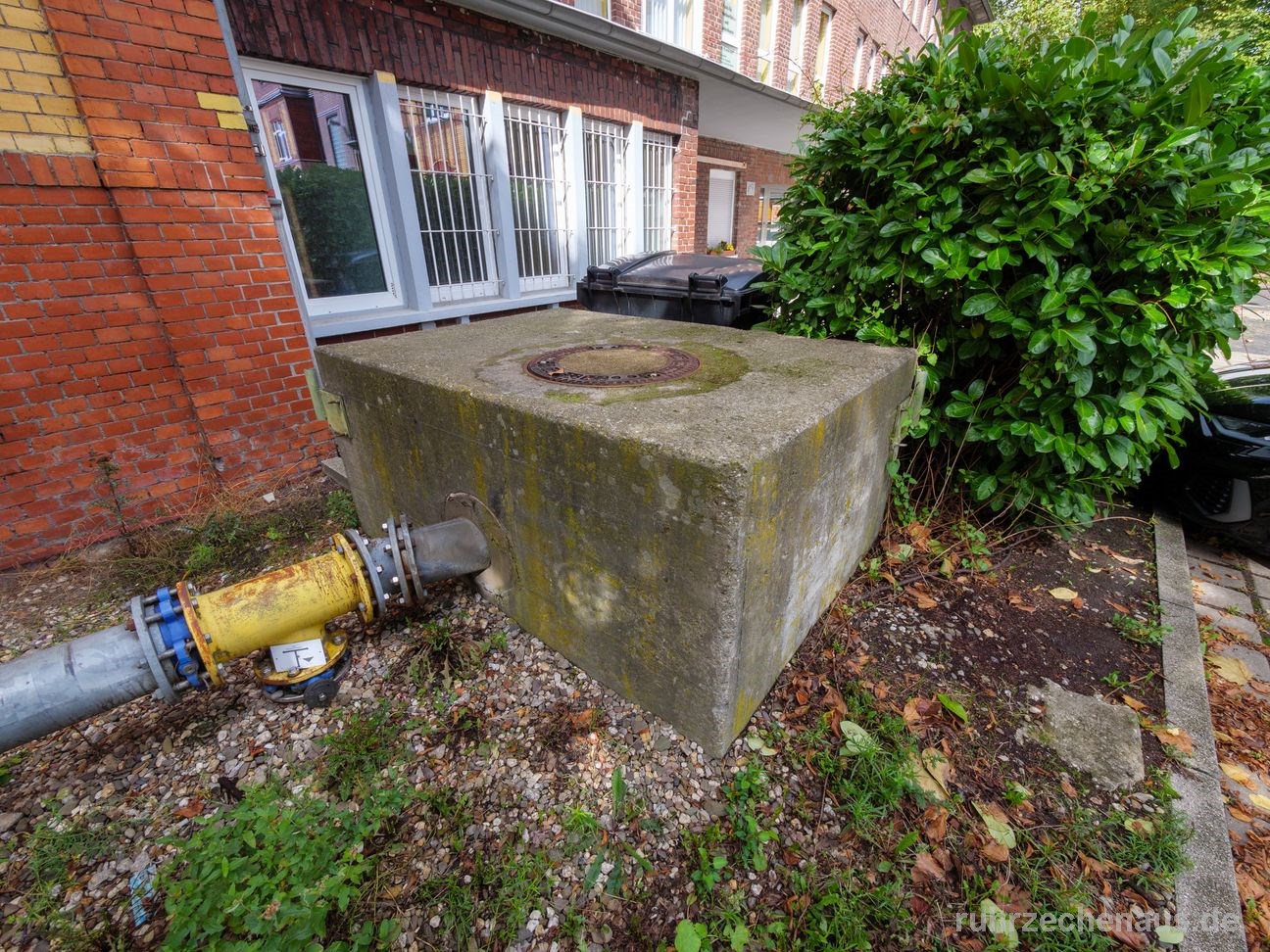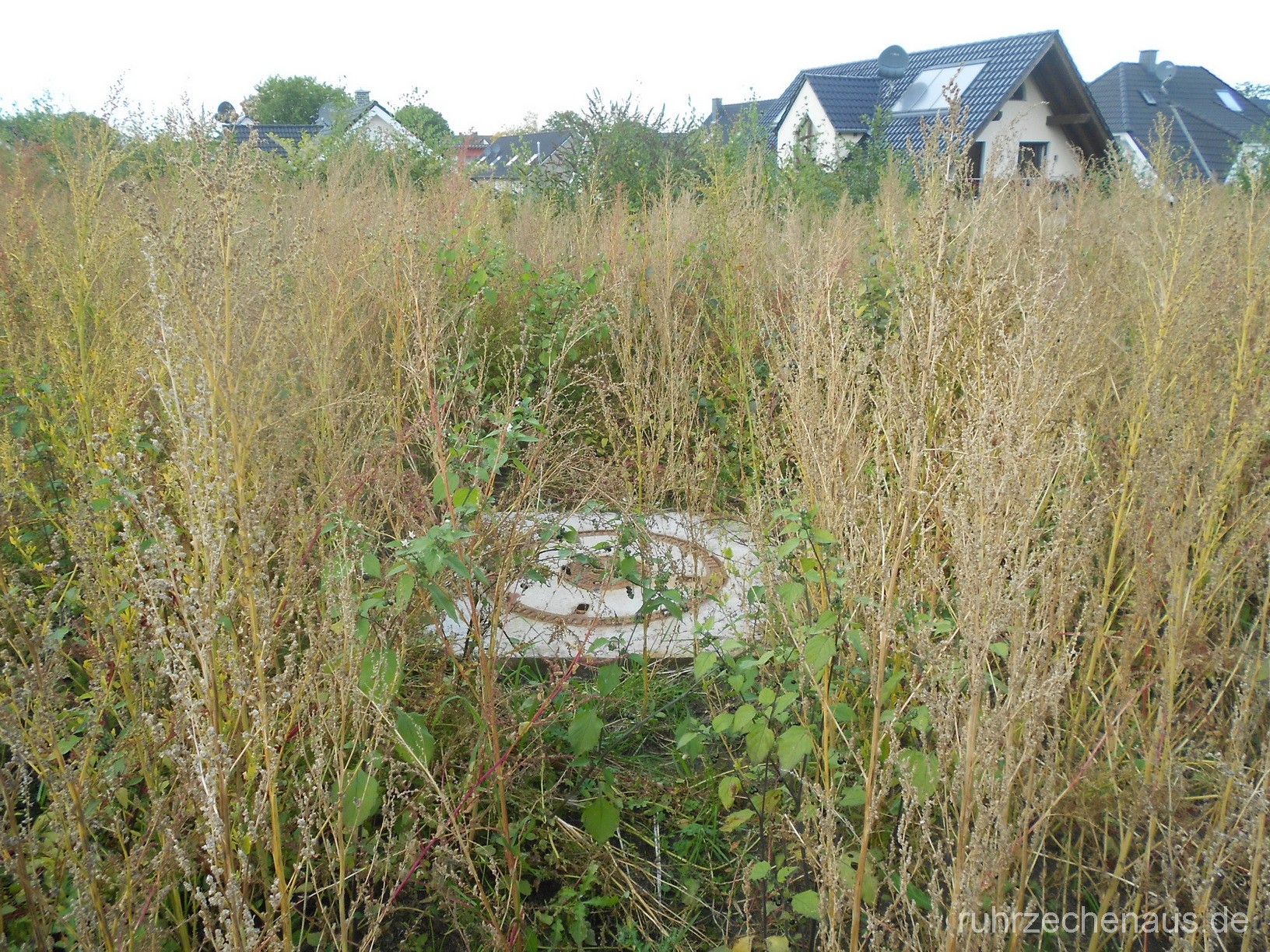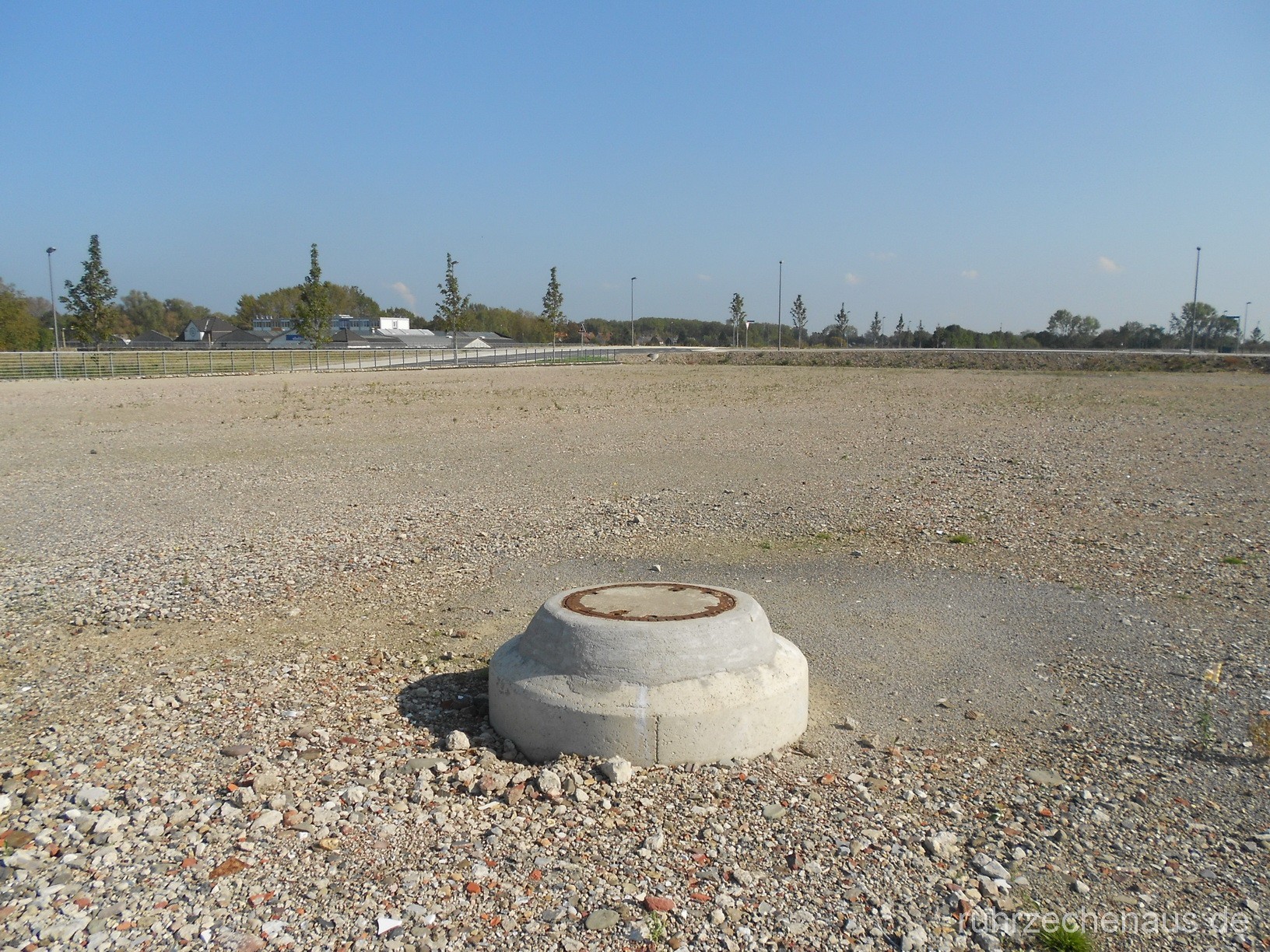 Der Schacht mit der Betonabdeckung liegt im Grünstreifen, der das Neubaugebiet vom Gewerbepark abschirmt. Er wurde 2015 saniert und