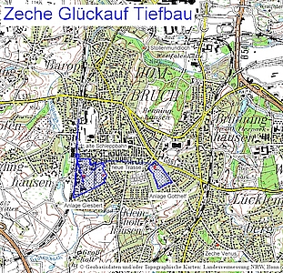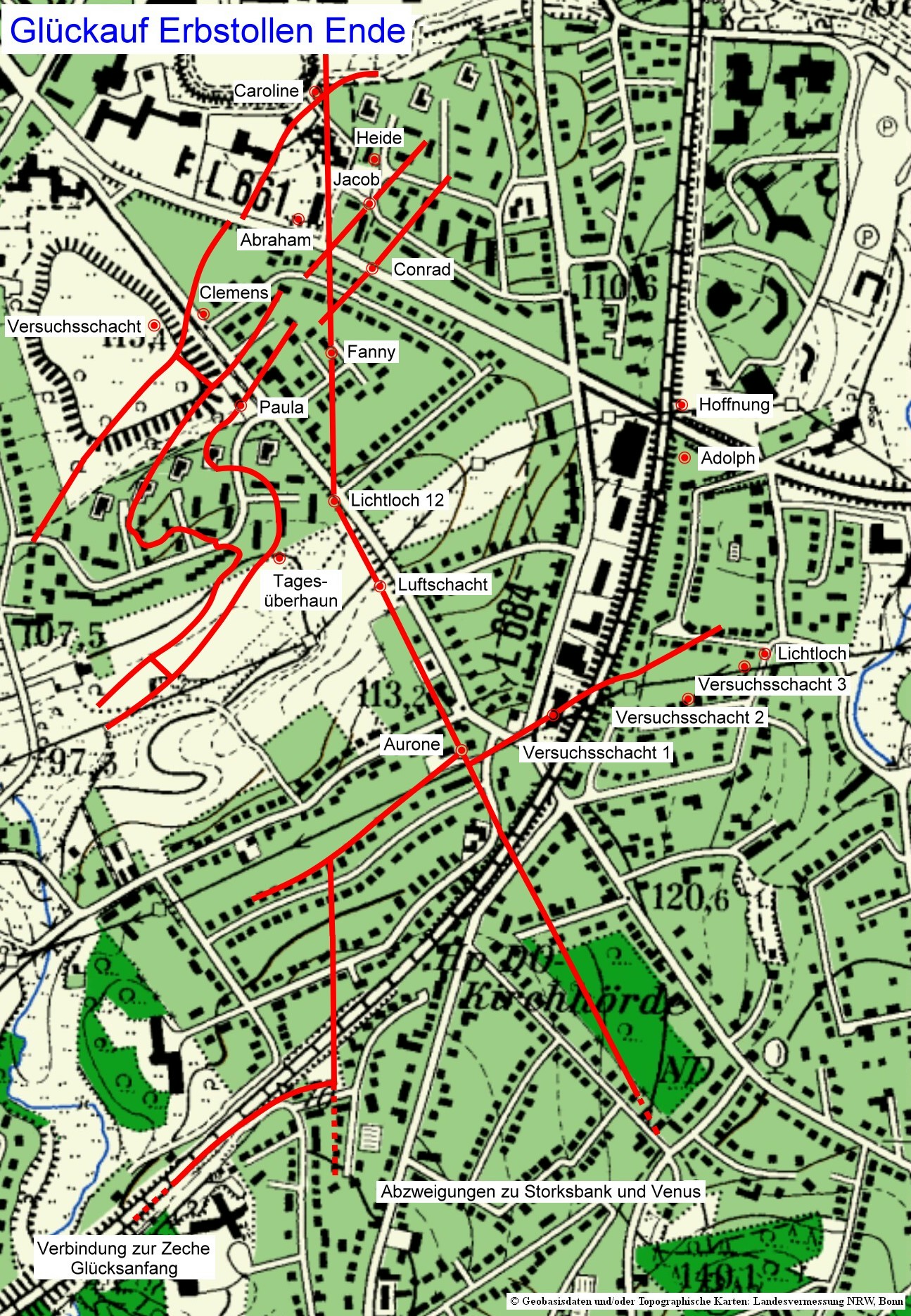 In der Karte sind einige Förderschächte, die auf älteren Karten an den Halden zu erkennen sind eingetragen. Von den Stollenschächten