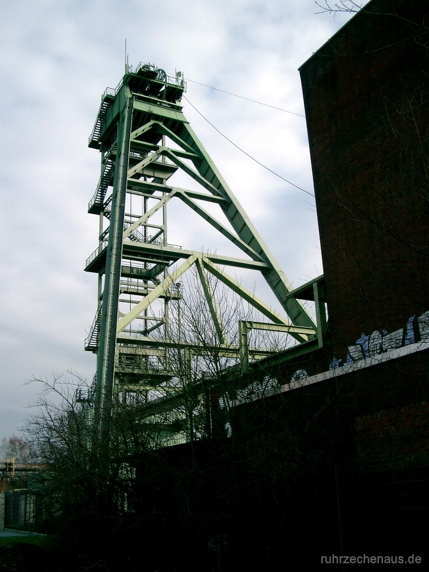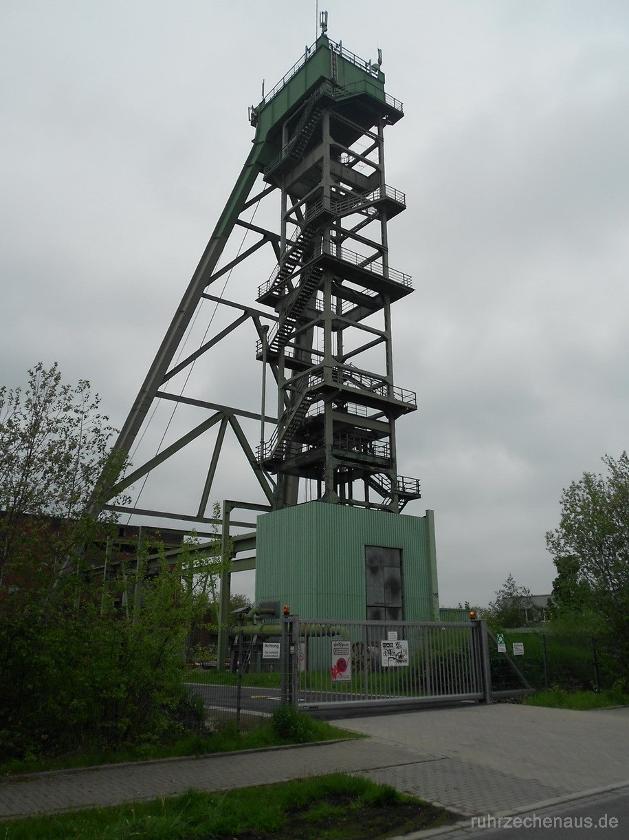 Bockgerüst für die Befahrungsanlage. Aus 715 m Tiefe wurde bis 2014 das Wasser abgepumpt und in die nahe Emscher geleitet. Die Schächte