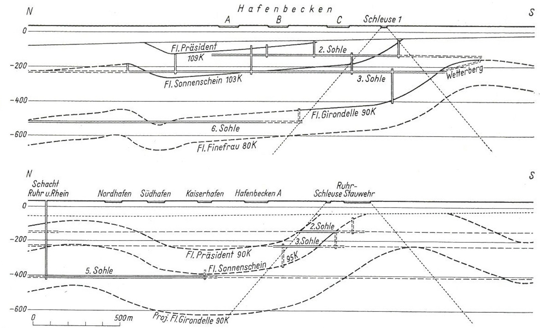 gearbeitet wurde bis hin zum Bruchbau. Abgebaut wurden die Flöze Sonnenschein (0,8 - 1 m), Präsident (1,1 - 1,3 m) und Girondelle (0,9 m).