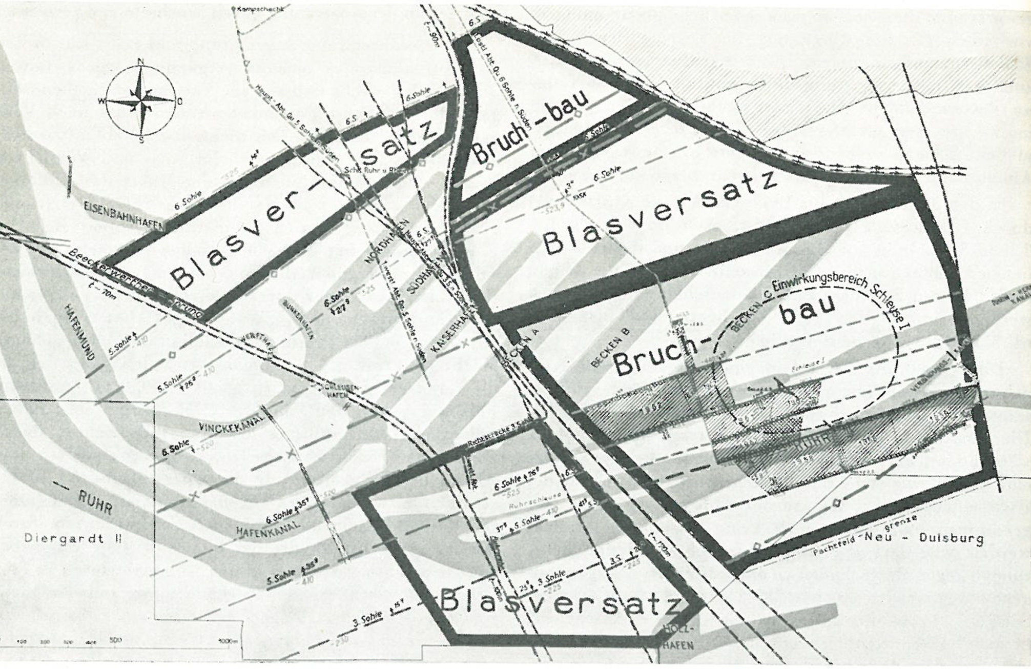 Werksanlagen, der Stadt Ruhrort und den Häfen starke Einschränkungen beim Abbau (ca. 50% der Berechtsame). Wegen der Gefahr von Überschwemmung