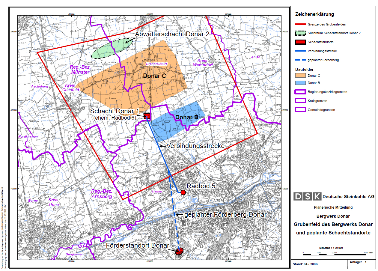 Seil- und Materialfahrt genutzt werden, Radbod 5 als Aussenschacht. Ein zusätzlicher Wetterschacht Donar 2 war fast an der