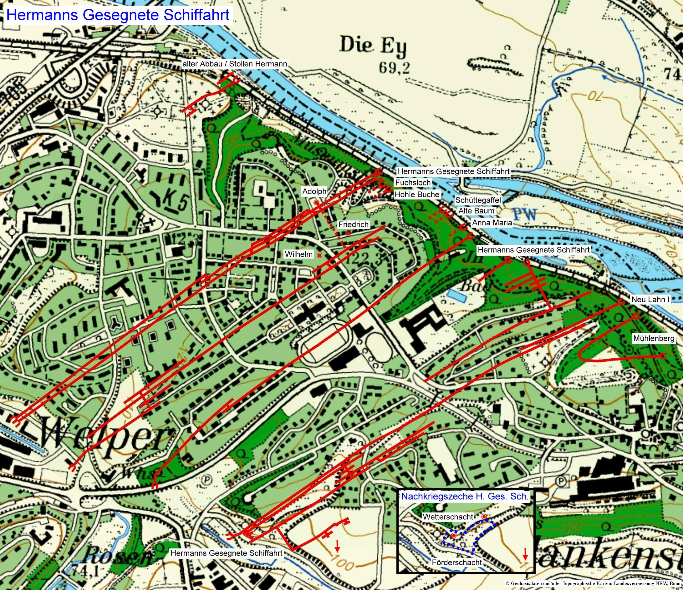 1811 aus Gutglück (nur Berechtsame, Abbau hatte nicht stattgefunden) und Hermann entstanden. Nach der nochmaligen Verleihung 1813 ging die Förderung stark zurück. Dabei wurde ab 1814 ein Stollen zur Ruhr benutzt. 1820 kam die Konsolidation zu Hermanns Gesegnete Schiffahrt.