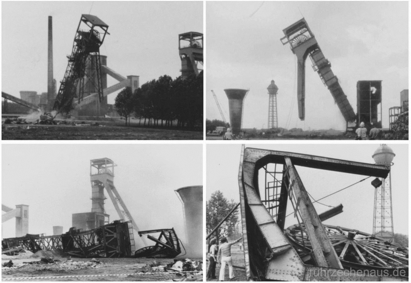 beim Abriss der Kokerei 1986 gesprengt. Die Fördergerüste waren schon 1979 mit allen Gebäuden der Schachtanlage abgerissen.