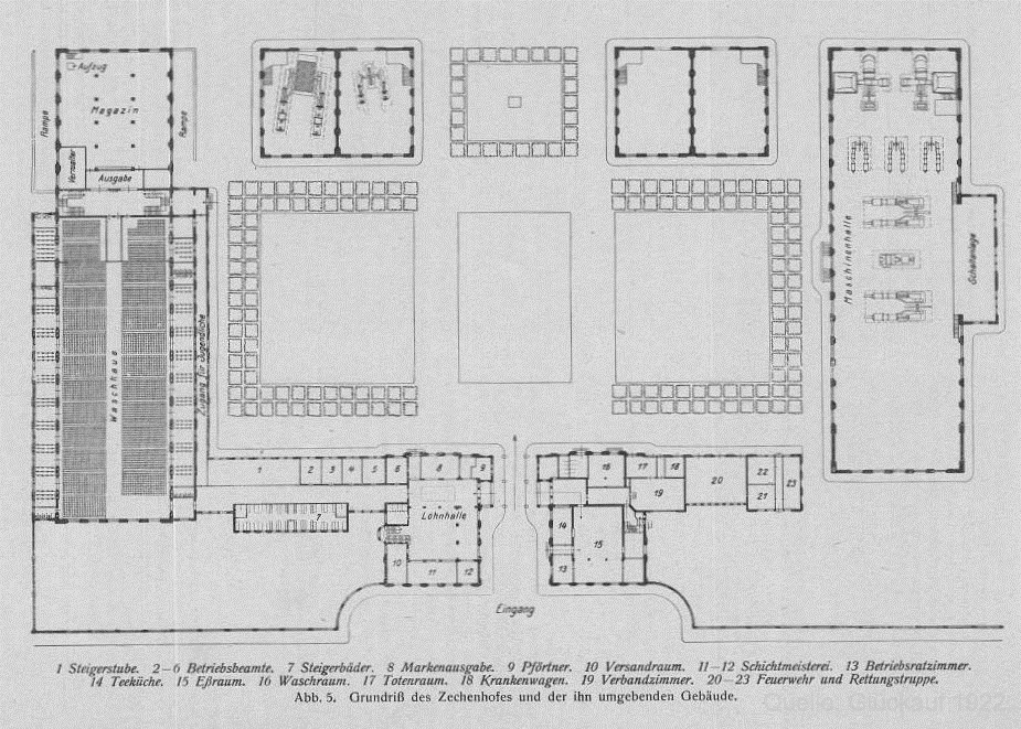 auch spätere Erweiterungen der Tagesanlagen und die Zechensiedlung umfasste. Es enstand von 1912 - 1920 eine großzügig gestaltete Anlage,