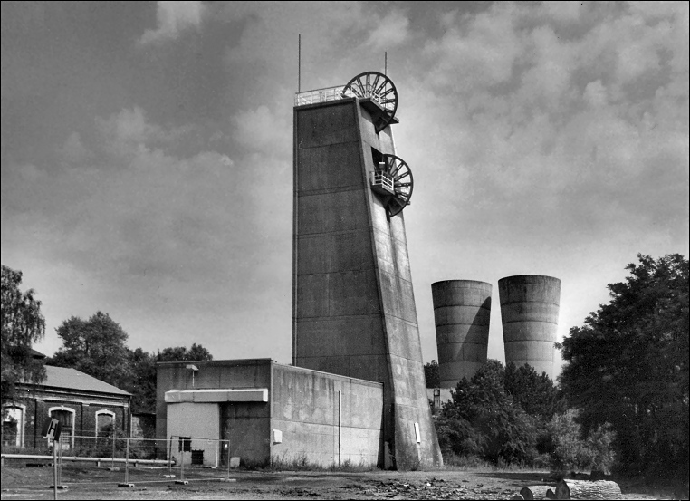 nur die Strebe aus Stahl. Sie nahm die gesamte Förderlast auf. Das Führungsgerüst war daher noch wie bei den Malokofftürmen