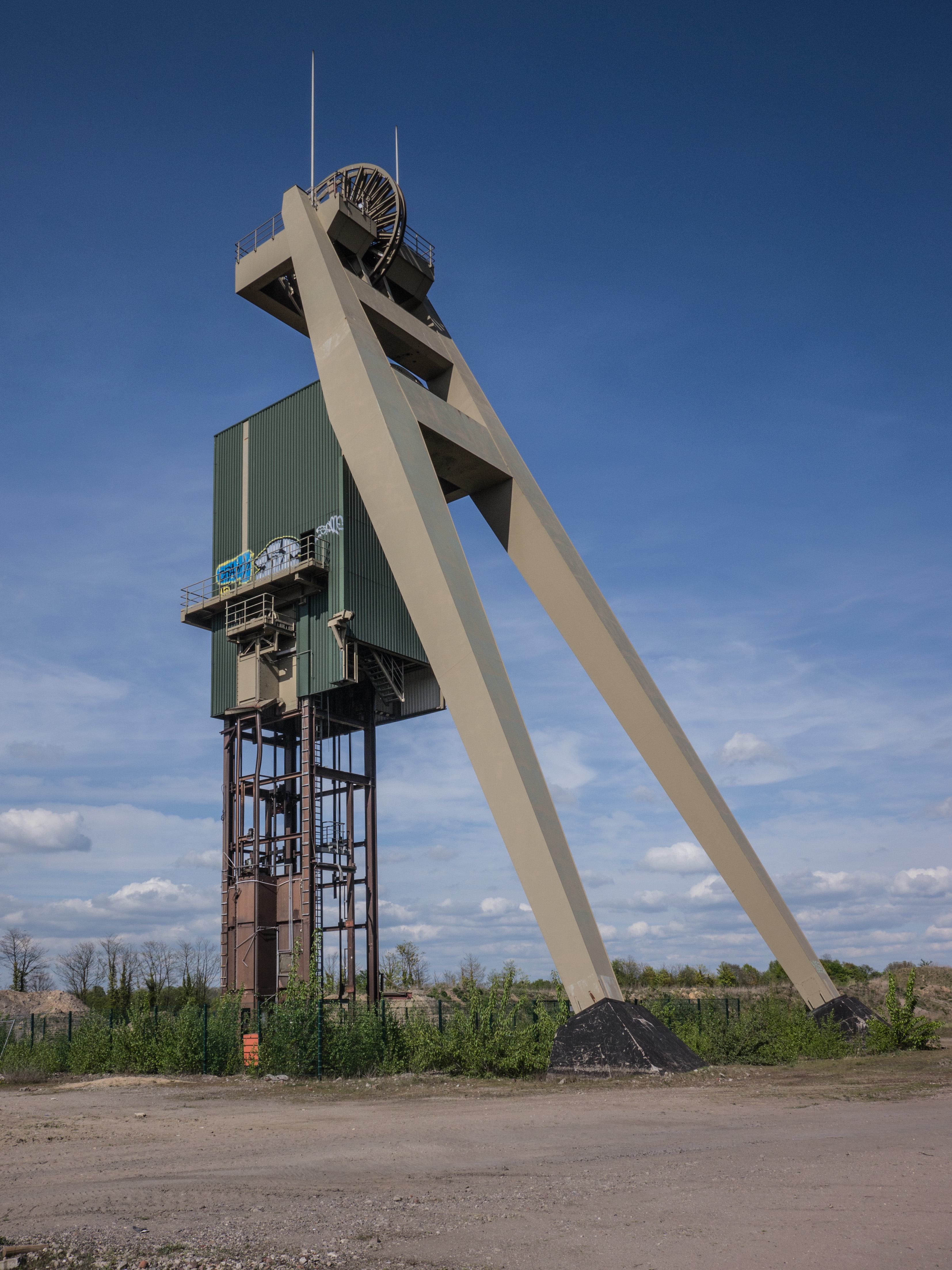 Turmförderanlage aus dem Jahr 1950. Durch die Bauweise in Stahlfachwerk konnte sie leicht demontiert werden (wie das Foto