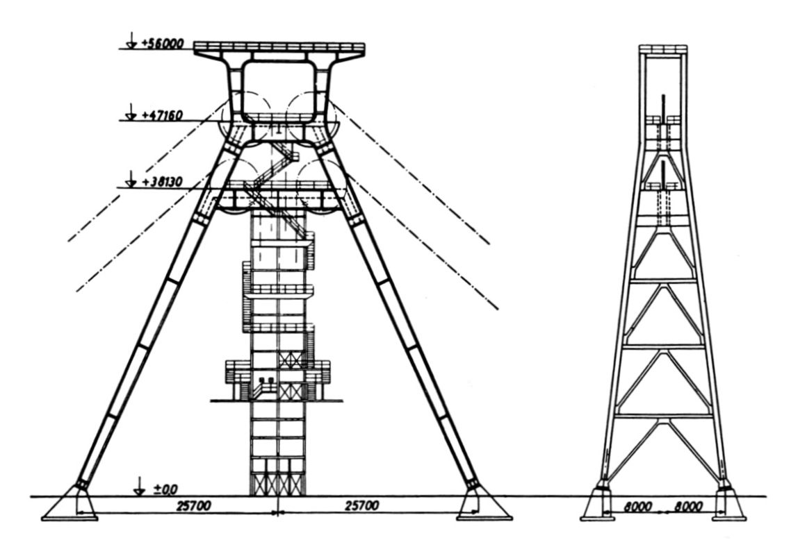 Die ab den 1930er Jahren in Vollwandbauweise errichteten Doppelstrebengerüste standen fast immer am Hauptförderschacht
