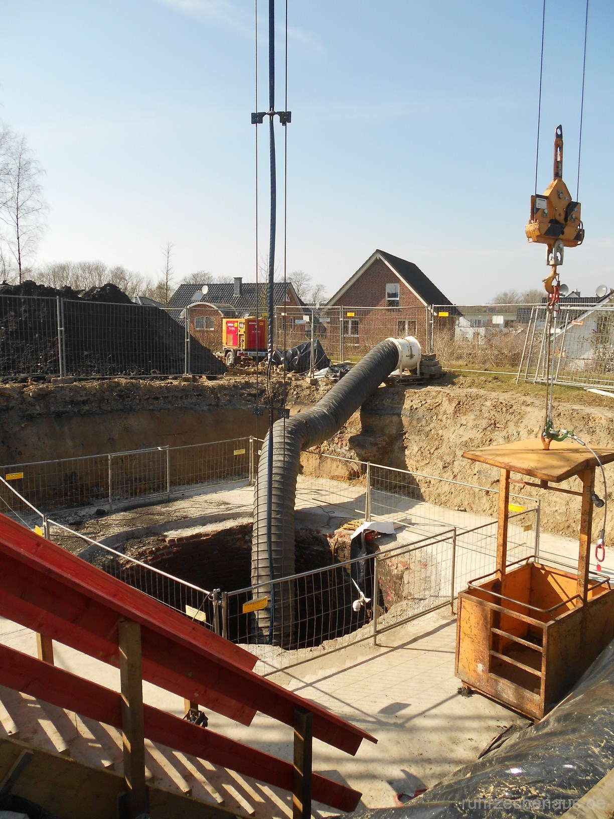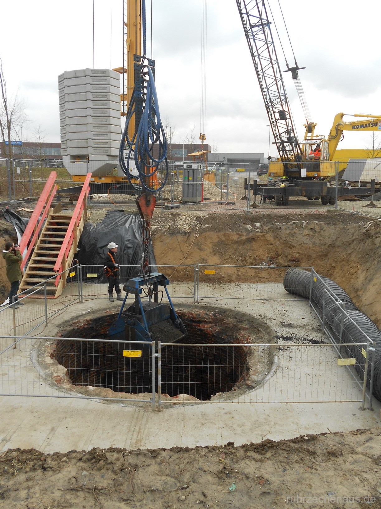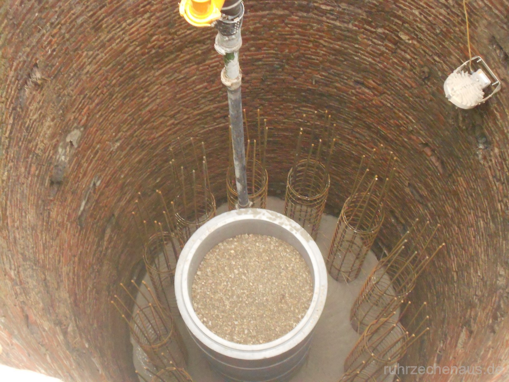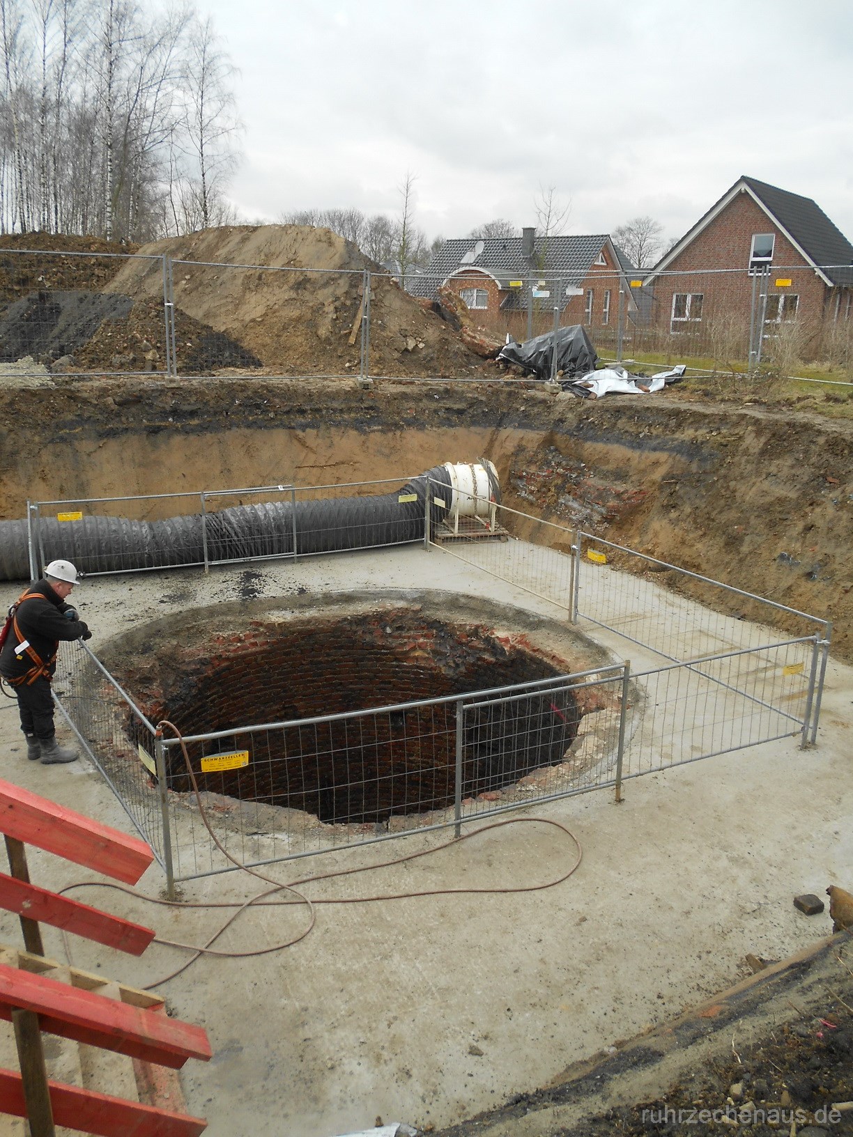 entfernt und eine etwa vier Meter tiefe Baugrube ausgehoben. Der gemauerte Schacht wurde bis auf dieses Niveau abgetragen. Für