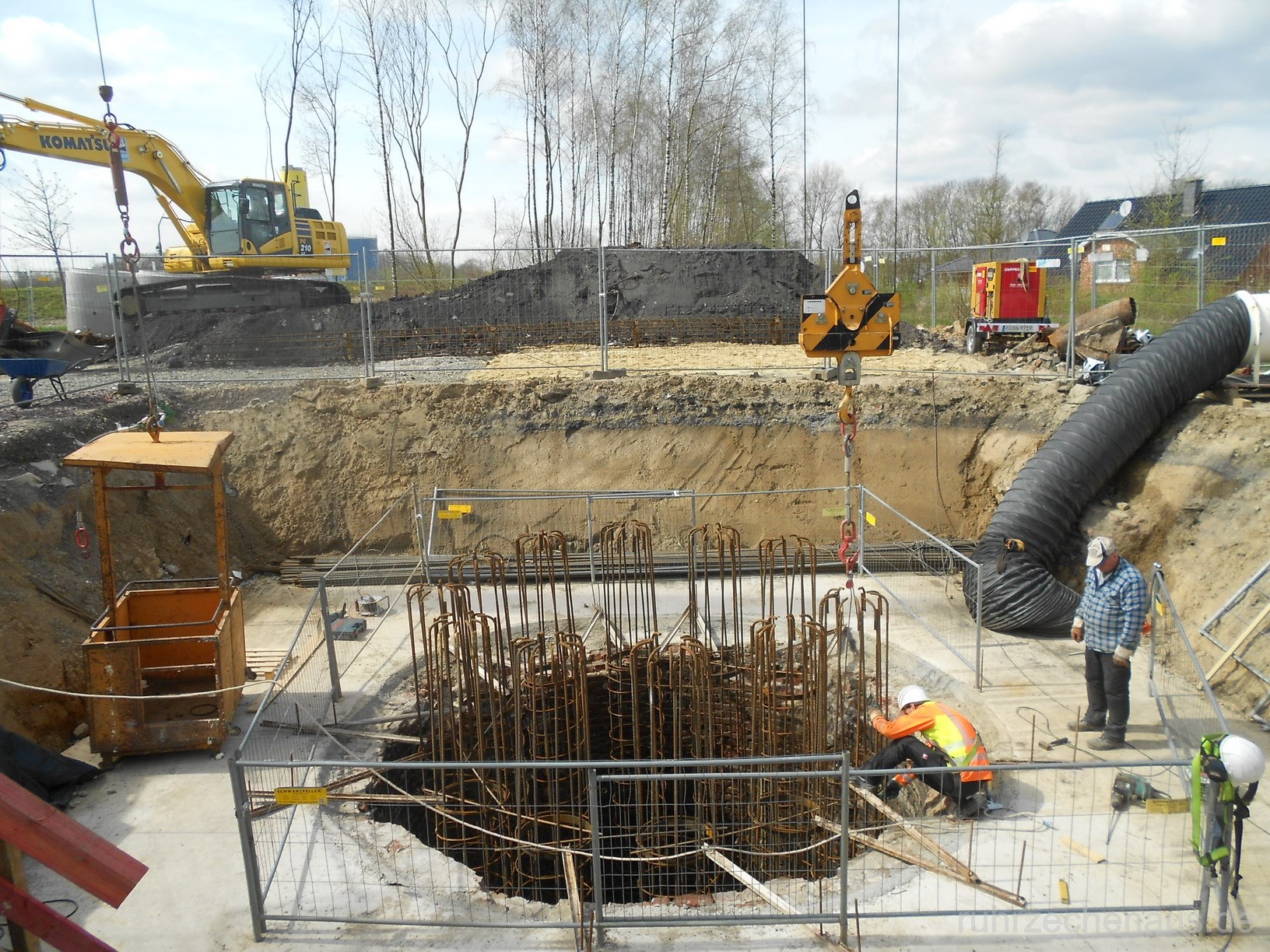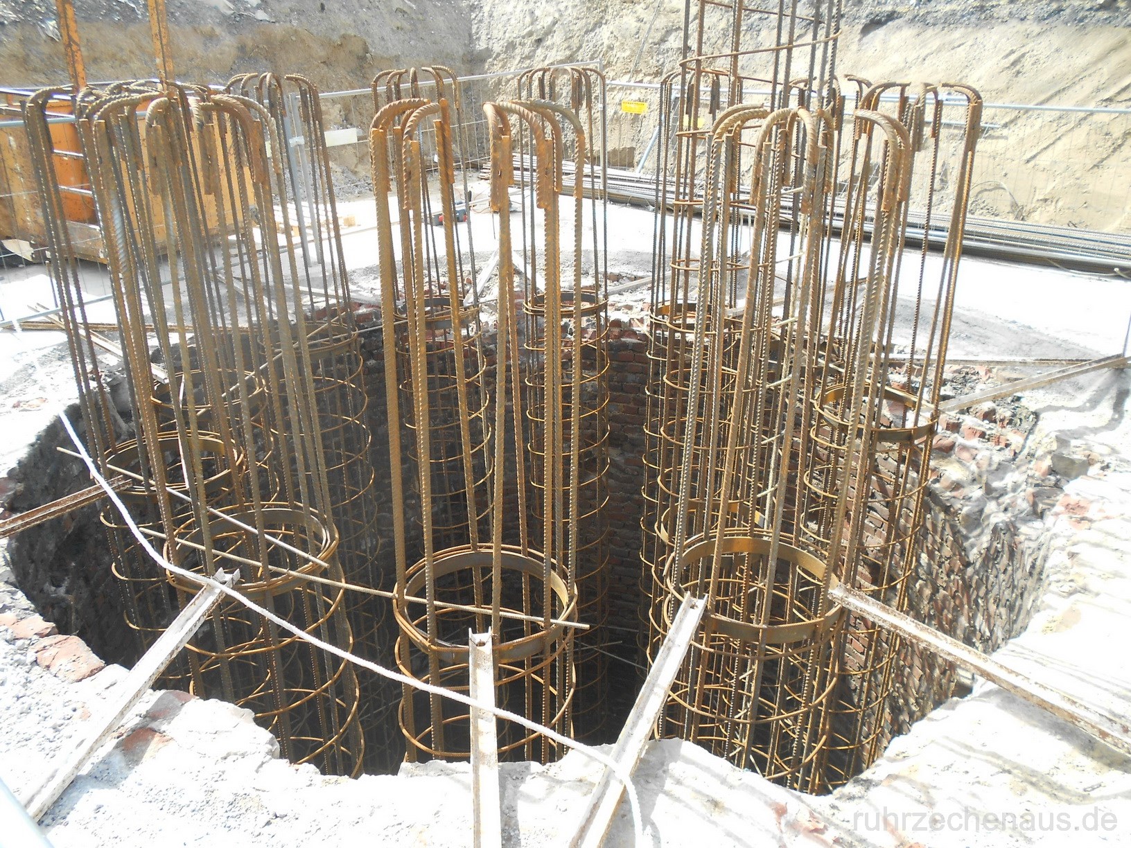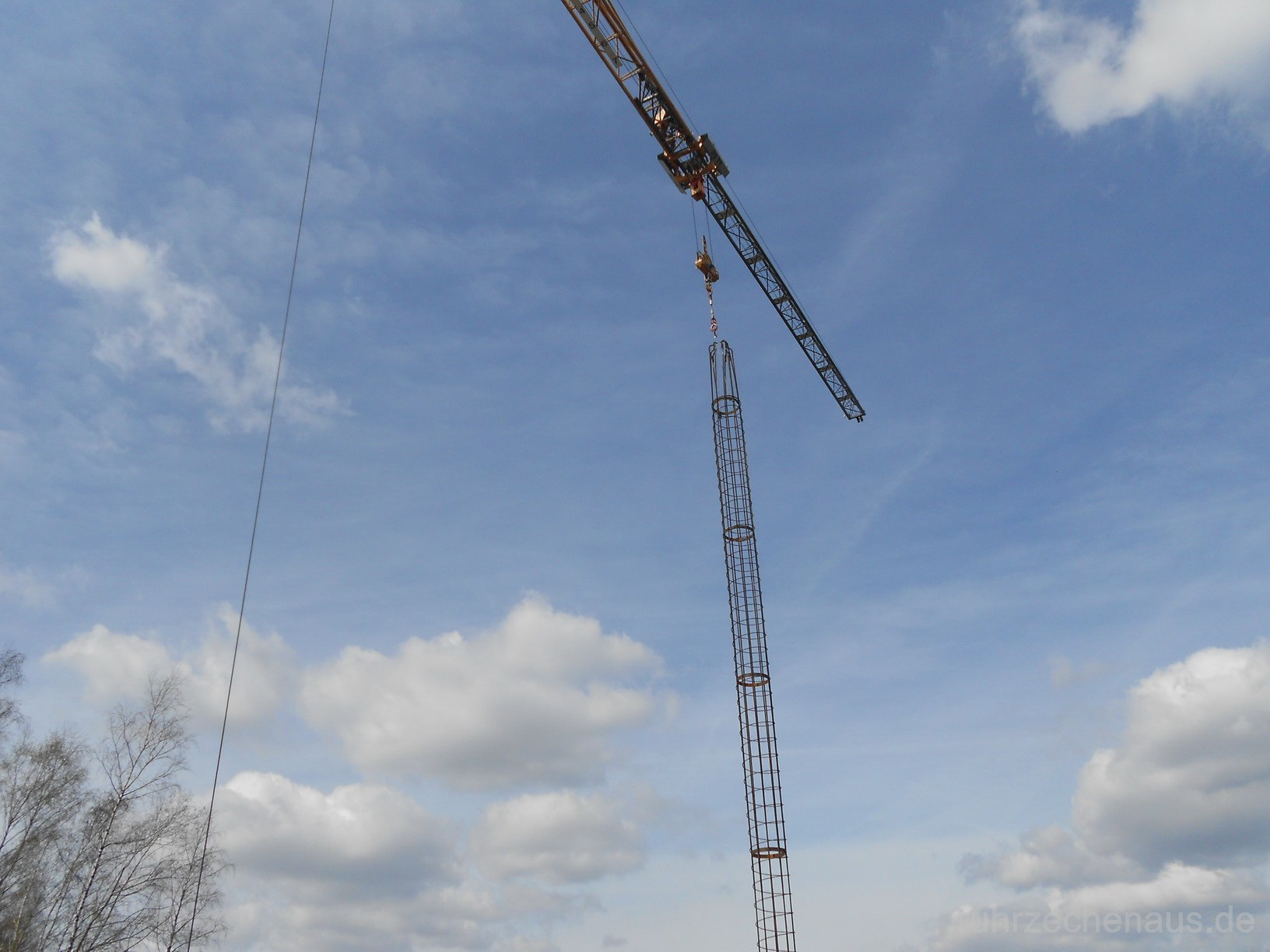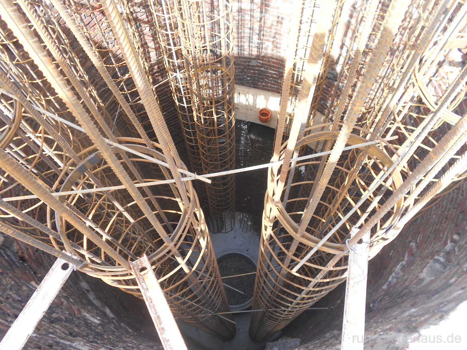 Die dritte Phase war das Verfüllen mit Beton und gleichzeitiges Einziehen der Schachtringe. Die etwa 14 Meter langen Armierungen wurden in zwei Schritten eingebaut.