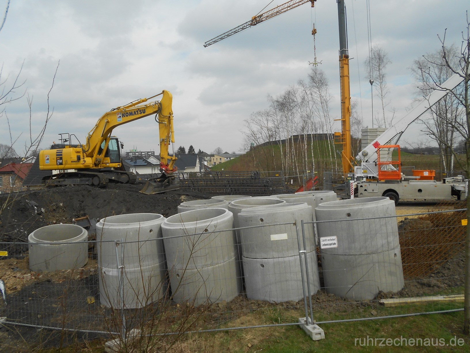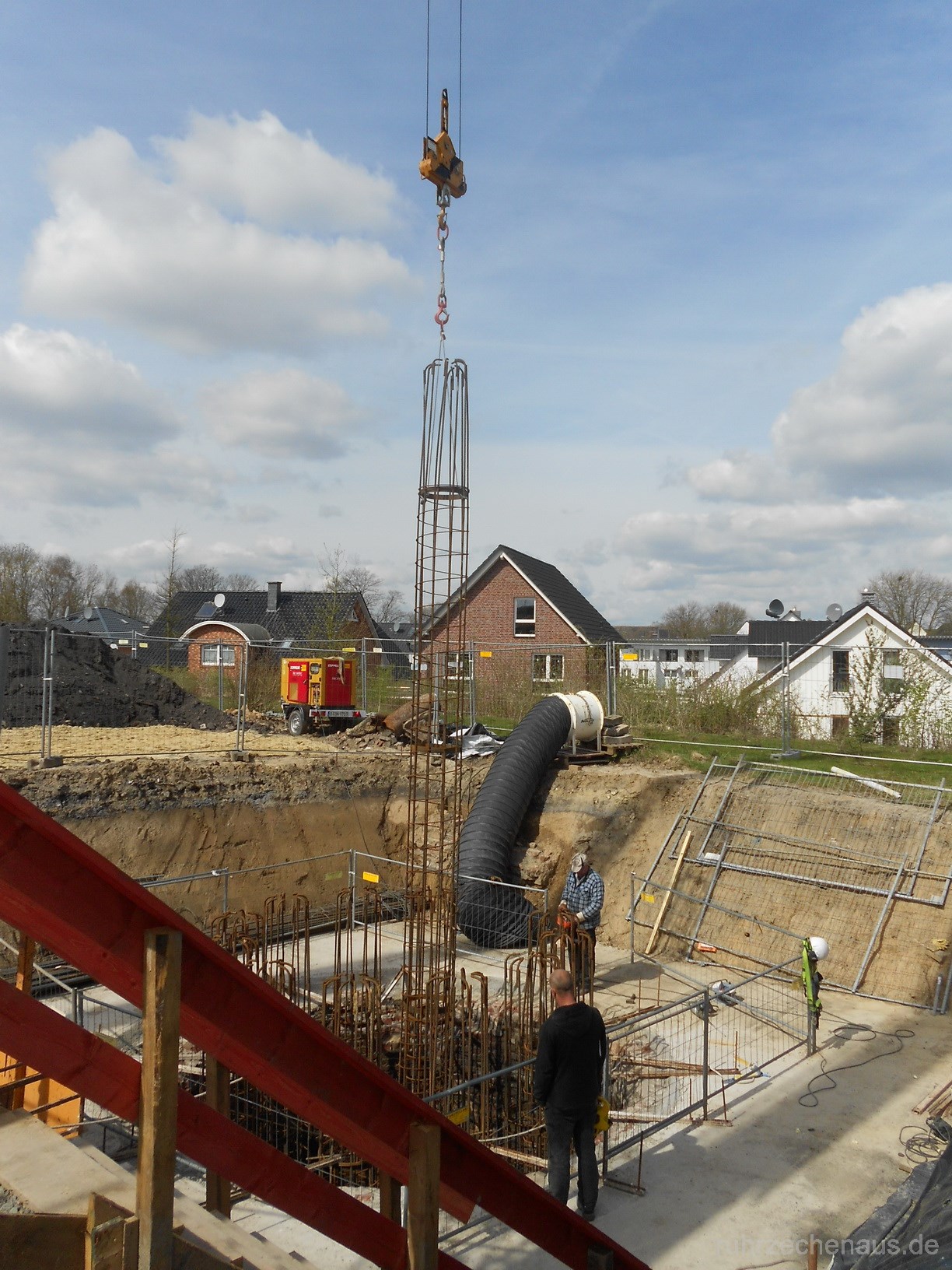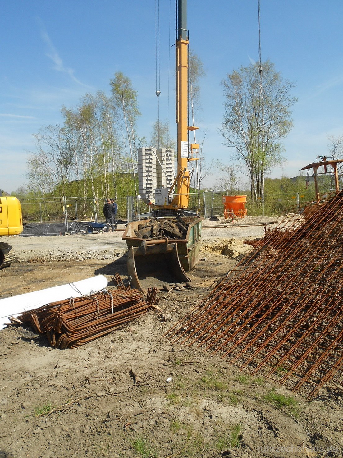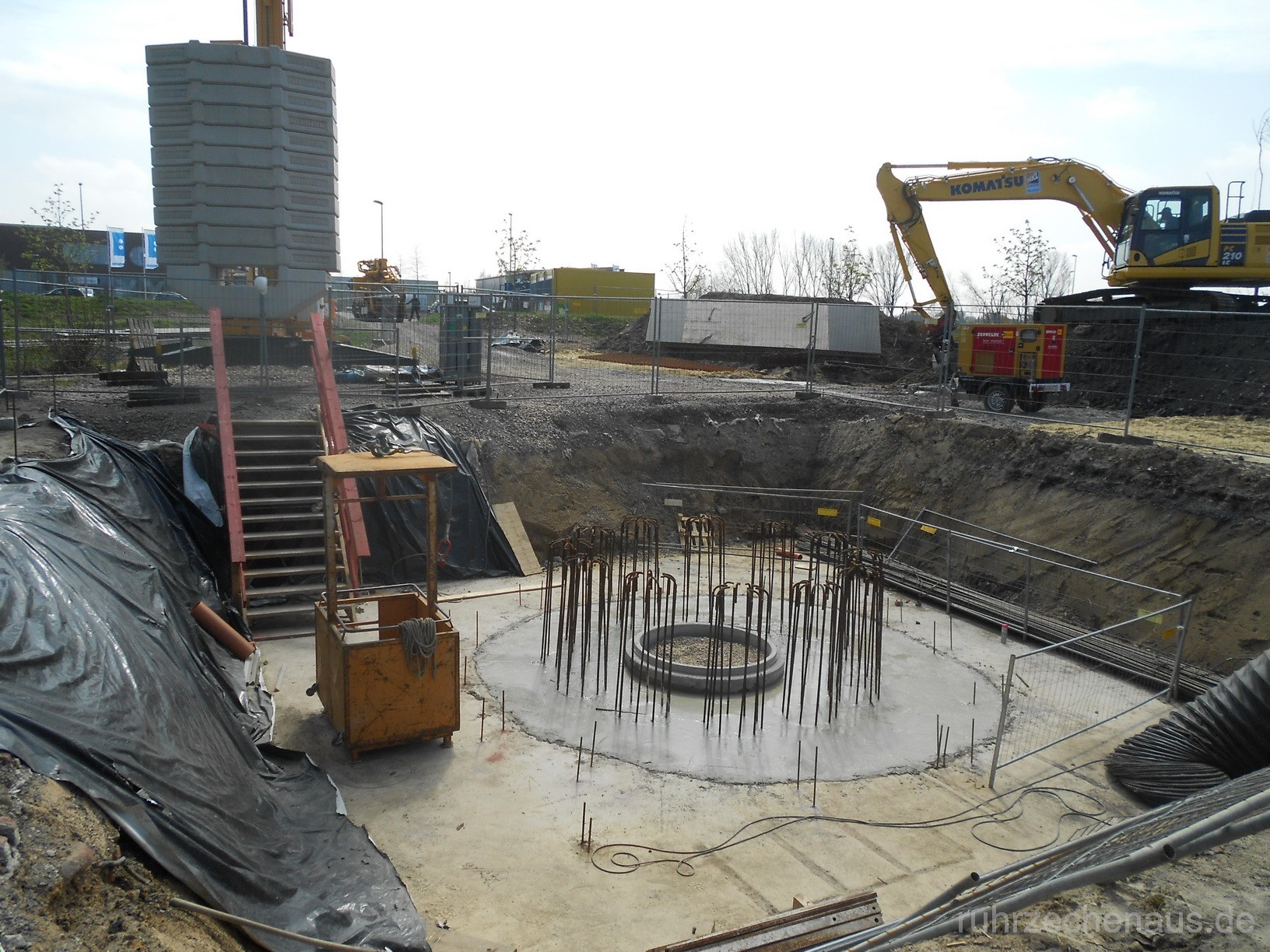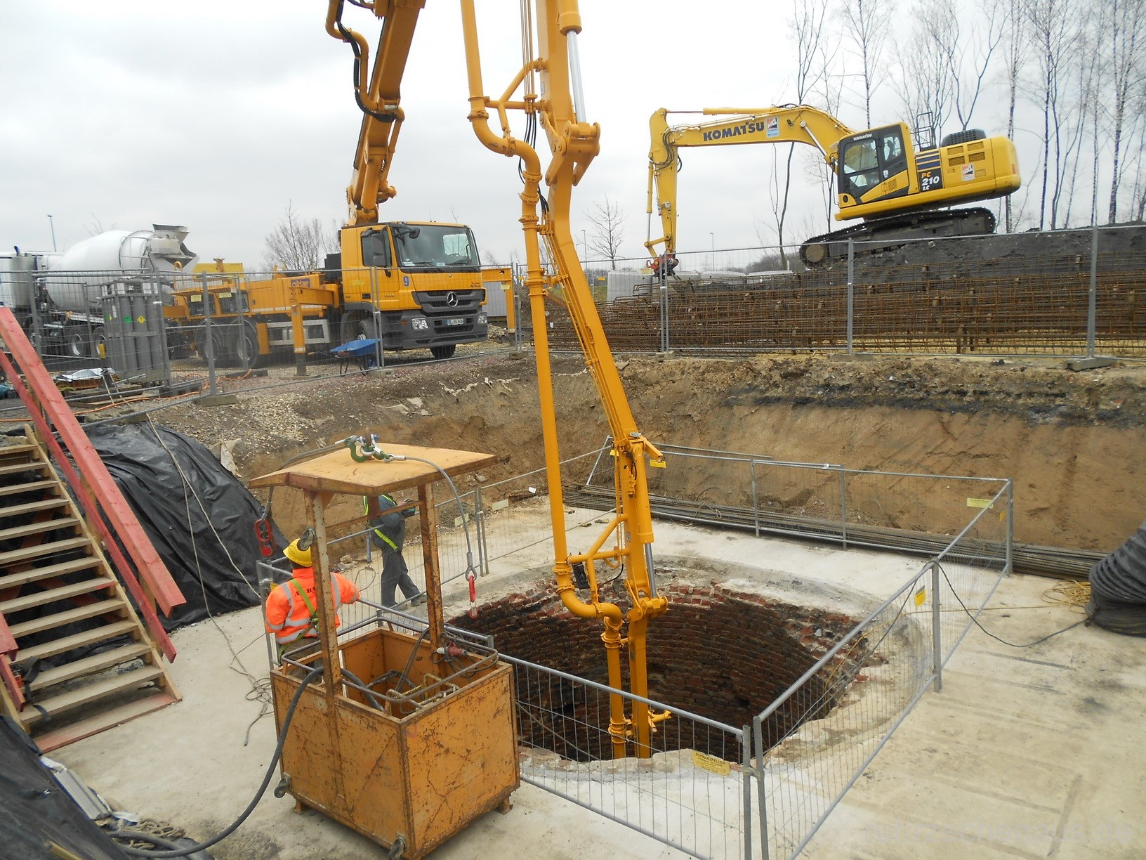 Die dritte Phase war das Verfüllen mit Beton und gleichzeitiges Einziehen der Schachtringe. Die etwa 14 Meter langen Armierungen wurden in zwei Schritten eingebaut.