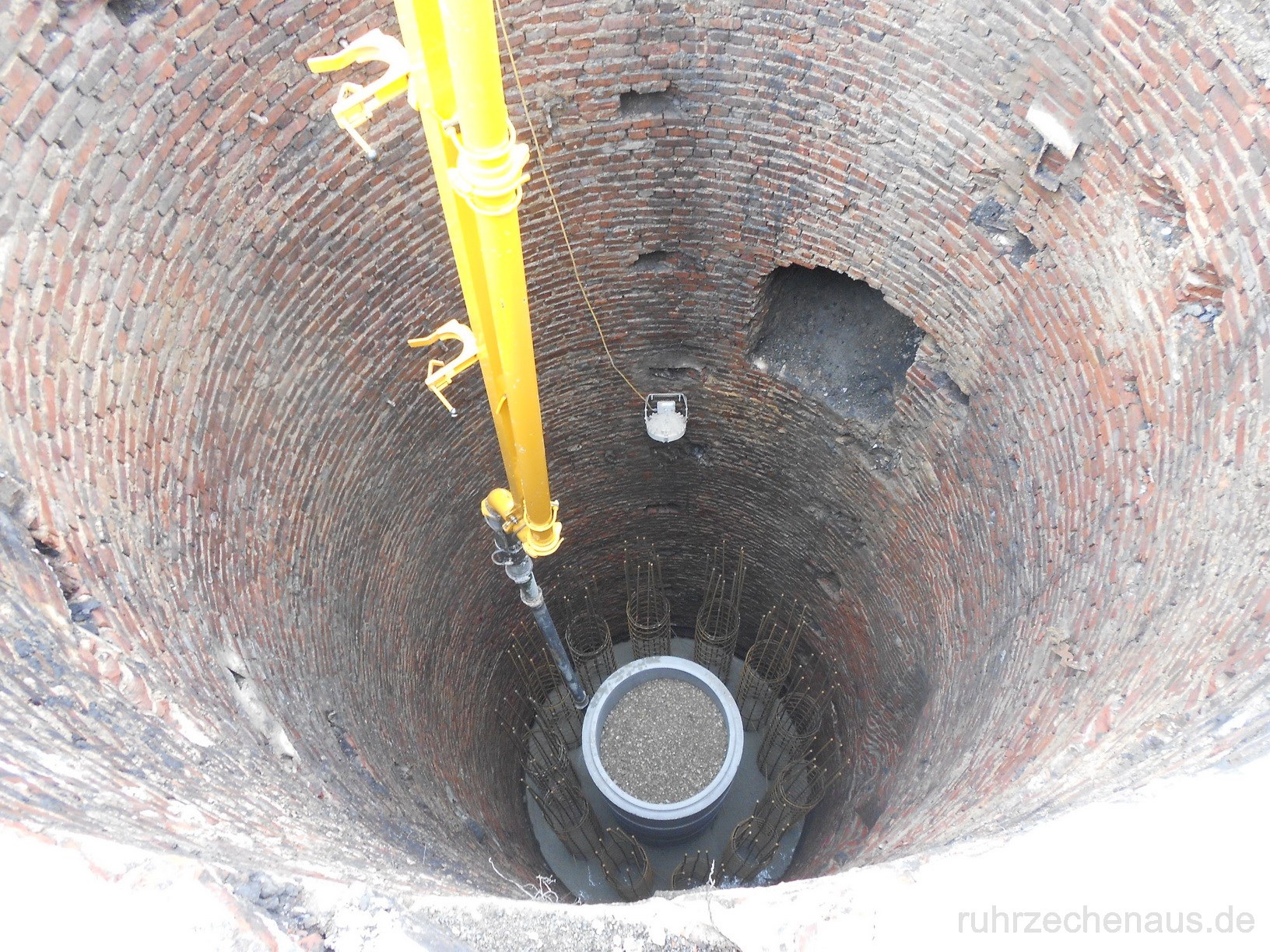 bei vielen voll verfüllten Schächten. Dabei wird ein etwa 10 - 30 m mächtiger massiver Betonpfropfen eingesetzt. Davor lag i.d.R.