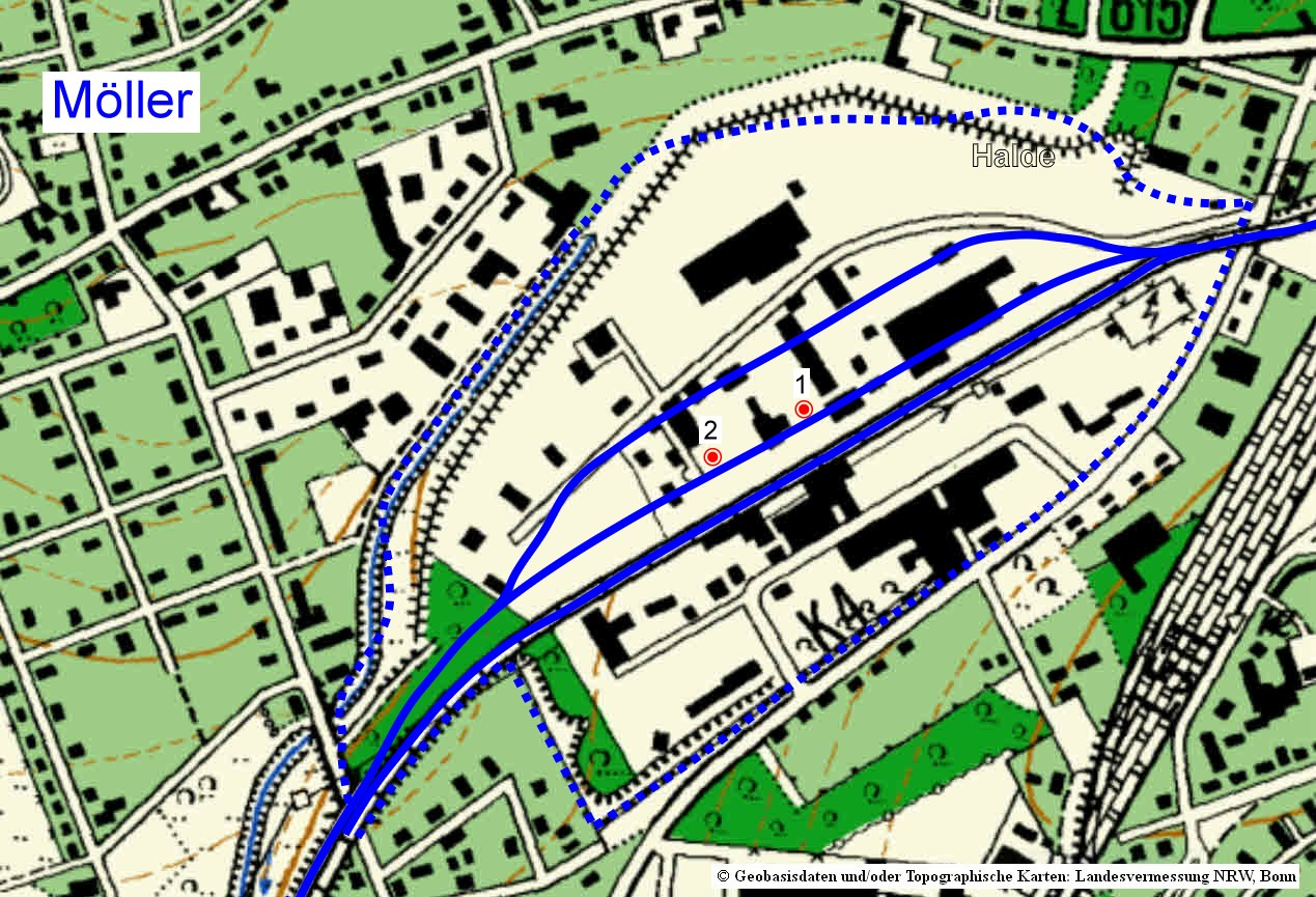 und liegen auf Betriebsgelände. Schacht 1 liegt auf dem Betriebshof einer Baufirma, Schacht 2 auf dem Lagerplatz für Bauschutt. Er