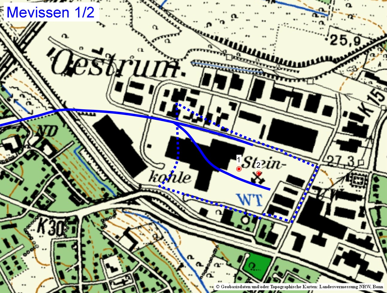 Das Zechengelände von Schacht 1/2 ist im Gewerbegebiet Mevissen aufgegangen. Alle Zechengebäude wurden nach der