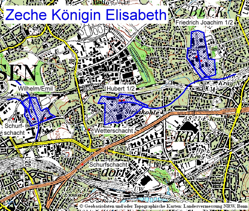 Die Grubenbaue der Zeche Königin Elisabeth reichten von der östlichen Essener Innenstadt bis in den Stadtteil