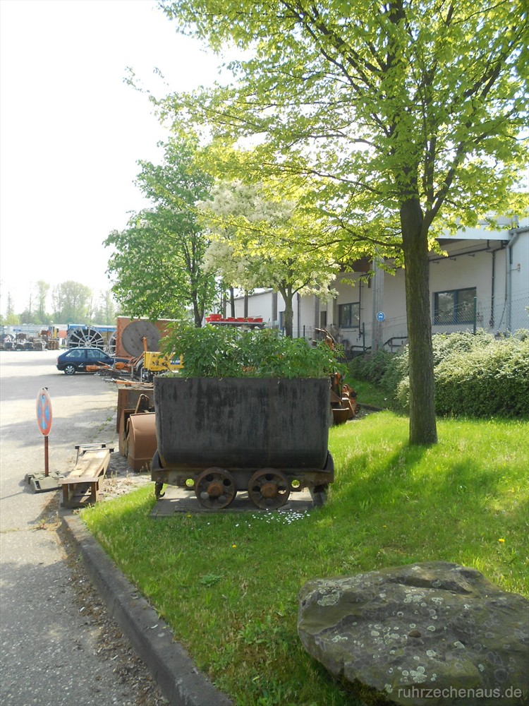 Kohlewagen in der Nähe deutet auf ihn hin. Erhalten blieb auch das Verwaltungs-/Kauengebäude im Eingangsbereich der Zeche, das