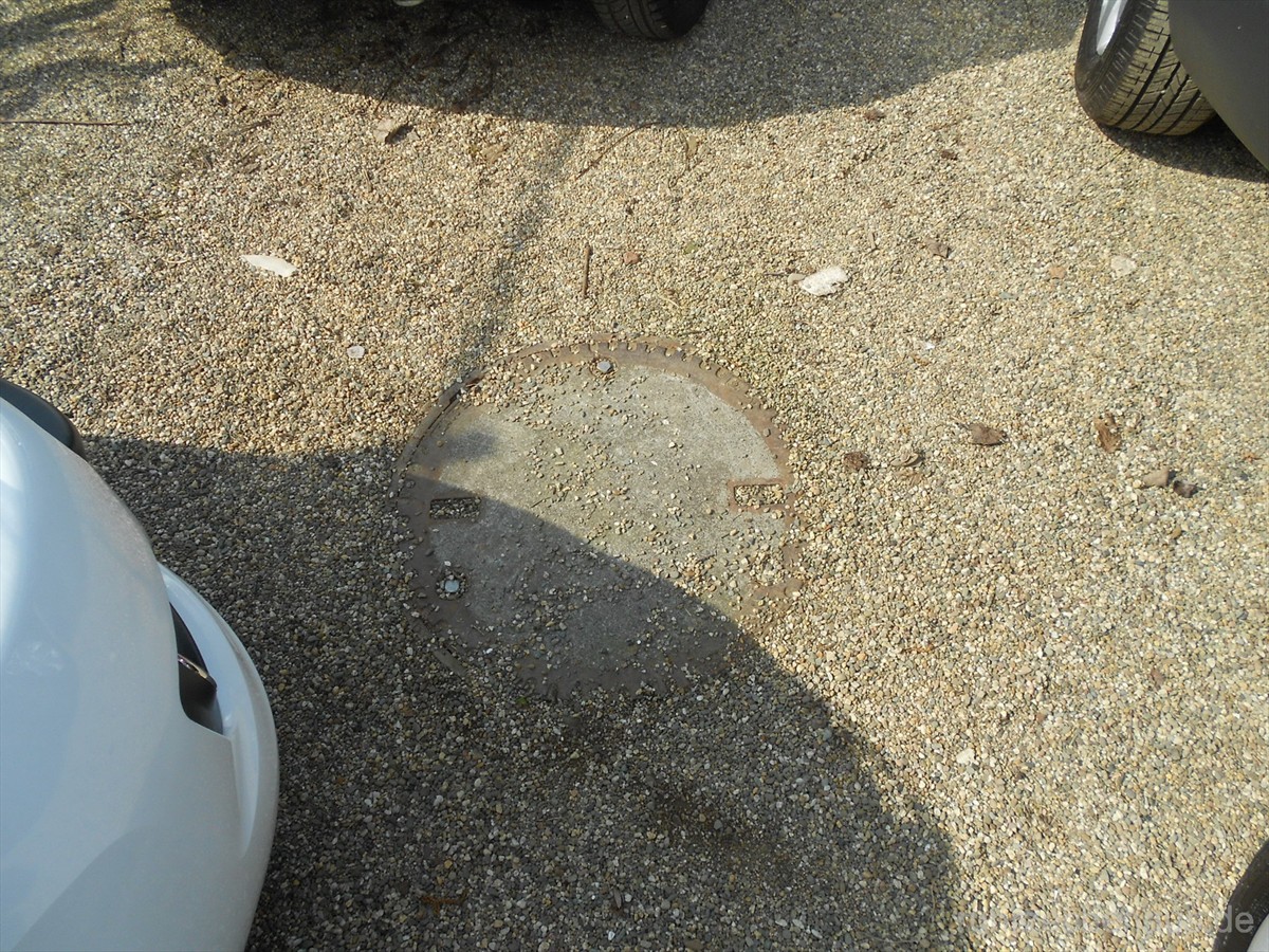 Stellplatz eines KFZ-Händlers und hat eine Revisionsöffnung. Eine Tafel mit den Schachtdaten zeigt die Lage an.