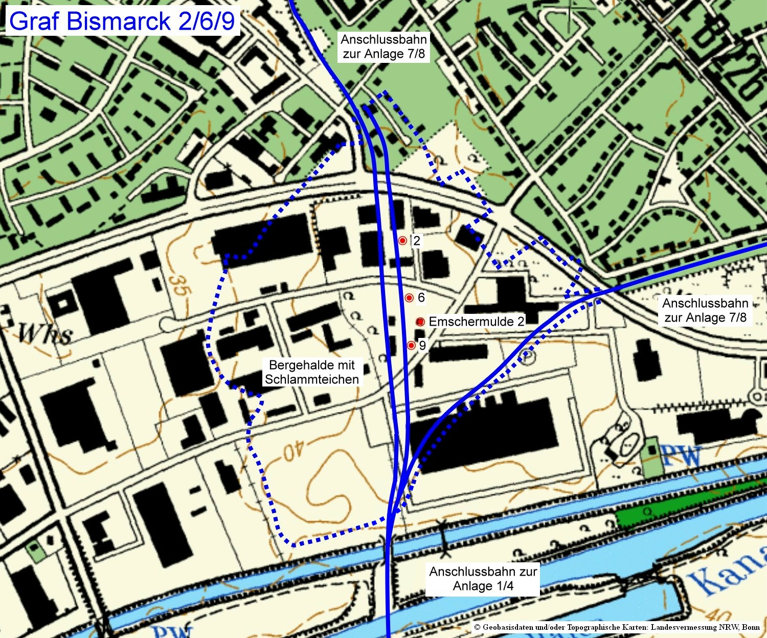 Das Gelände von Schacht 2/6/9 lag nur durch Kanal und Emscher getrennt nördlich von Schacht 1/4. Hier wurde